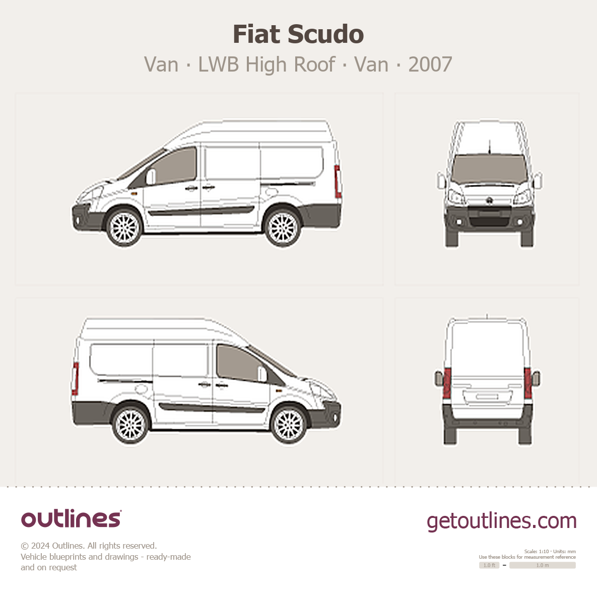 This is a blueprint of the Scudo, produced by carmaker Fiat in 2007 - 2016. It features a Van body design and is classified as a Commercial vehicle.