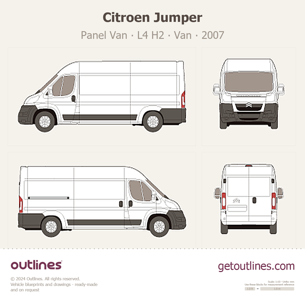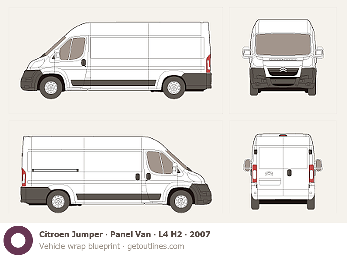 This 2007 Citroen Jumper Panel Van L4 H2 Van blueprint helps designers, wrap studios, and 3D artists simplify their workflow and save valuable time for creative work instead of routine tasks.