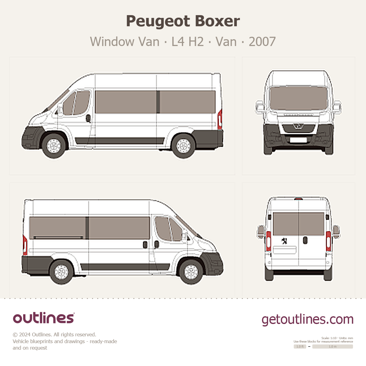 This is a blueprint of the Boxer, produced by carmaker Peugeot in 2007 - 2014. It features a Van body design and is classified as a Commercial vehicle.