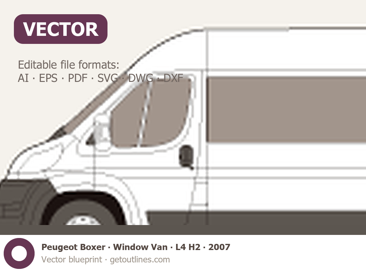 This 2007 Peugeot Boxer Window Van L4 H2 Van blueprint helps designers, wrap studios, and 3D artists simplify their workflow and save valuable time for creative work instead of routine tasks.