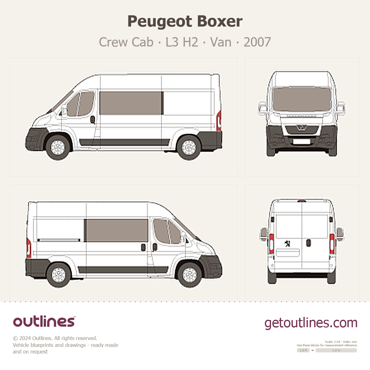This 2007 Peugeot Boxer Crew Cab L3 H2 Van blueprint helps designers, wrap studios, and 3D artists simplify their workflow and save valuable time for creative work instead of routine tasks.
