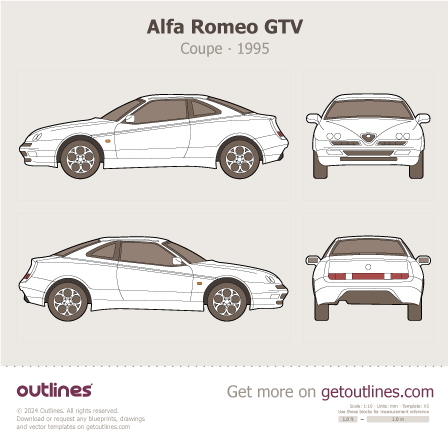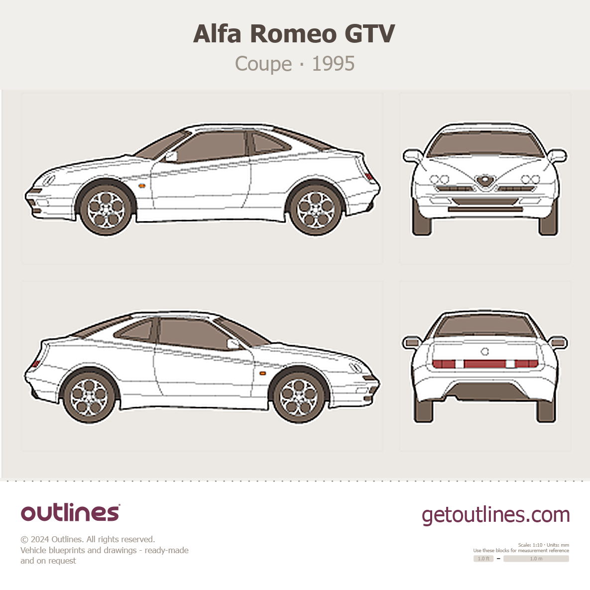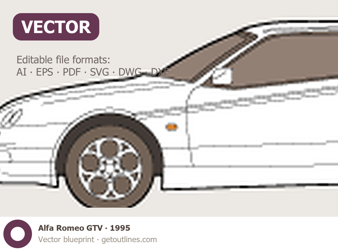 Buy this Alfa Romeo GTV blueprint and line drawing in high-quality editable vector file formats. Best for 3D and car wrap design.