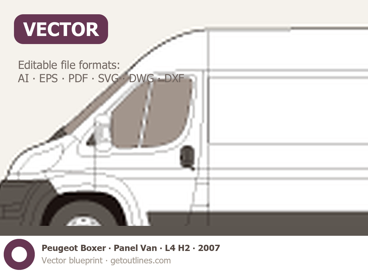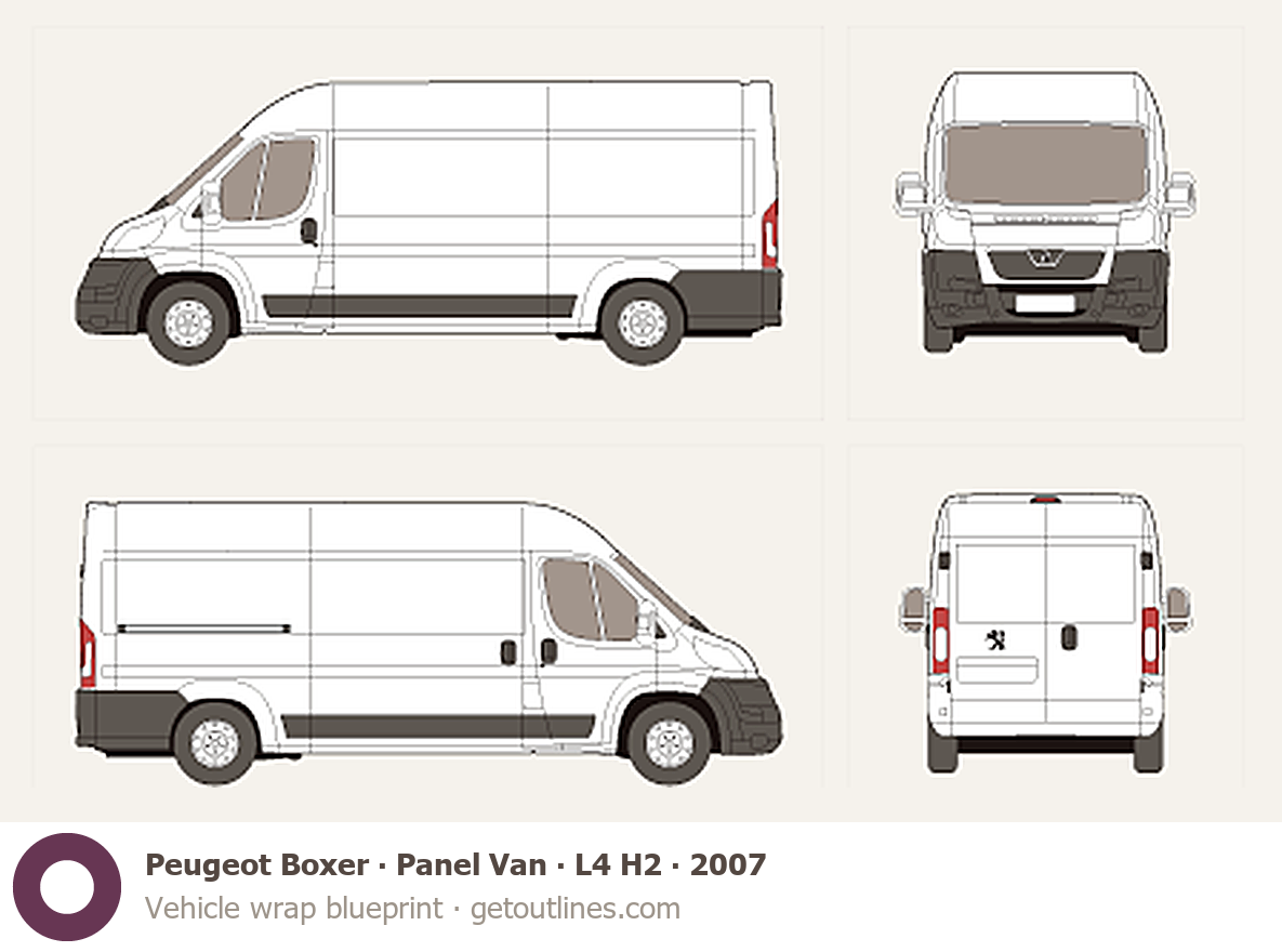 This 2007 Peugeot Boxer Panel Van L4 H2 Van blueprint helps designers, wrap studios, and 3D artists simplify their workflow and save valuable time for creative work instead of routine tasks.