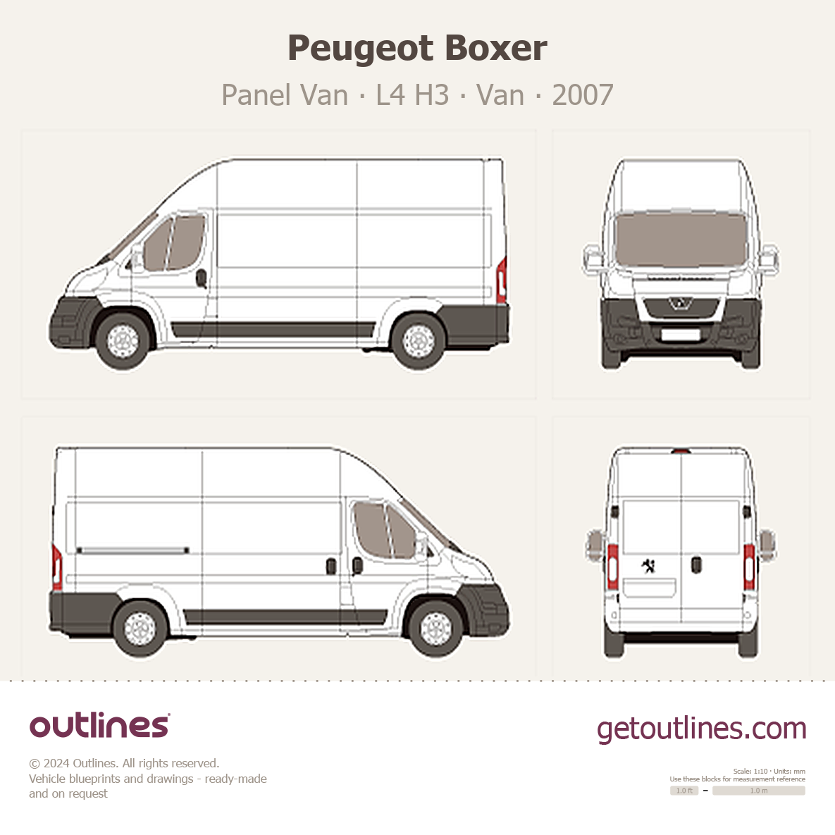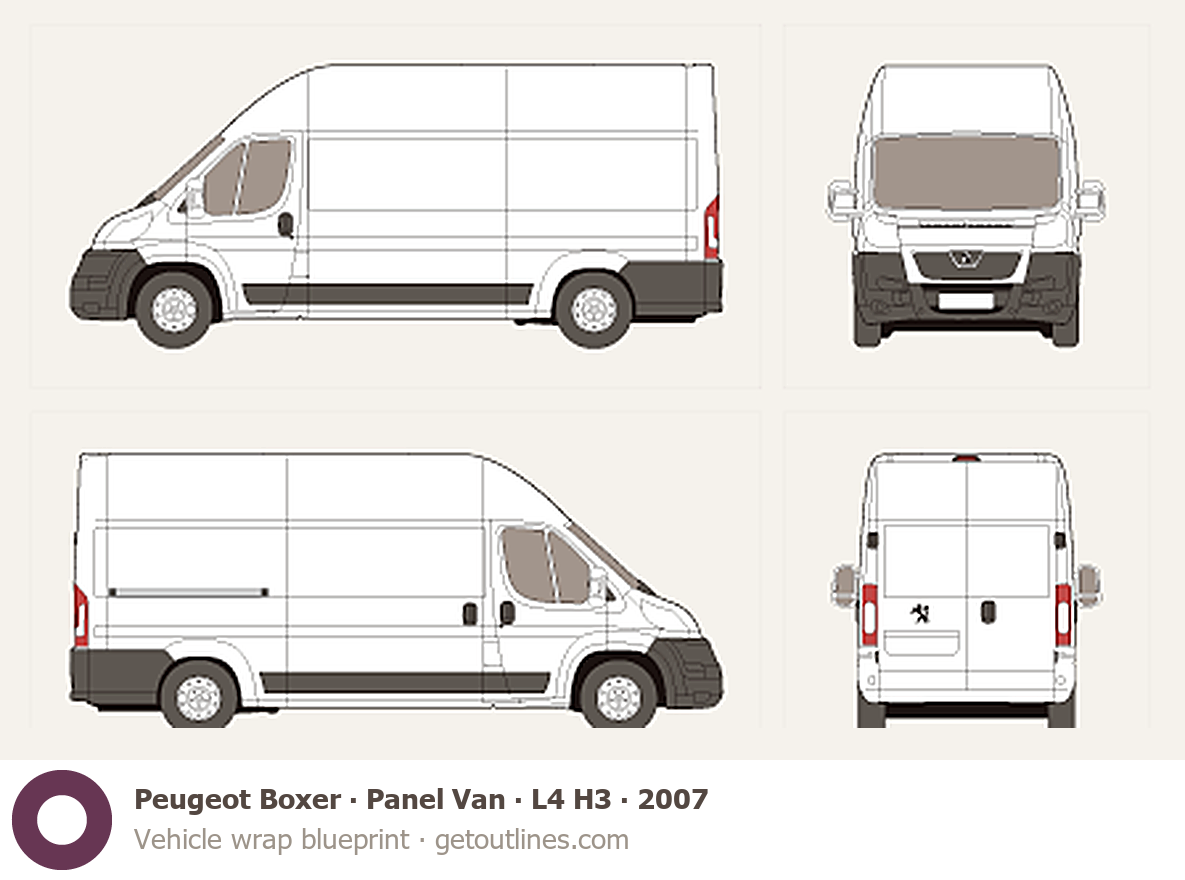 This 2007 Peugeot Boxer Panel Van L4 H3 Van blueprint helps designers, wrap studios, and 3D artists simplify their workflow and save valuable time for creative work instead of routine tasks.