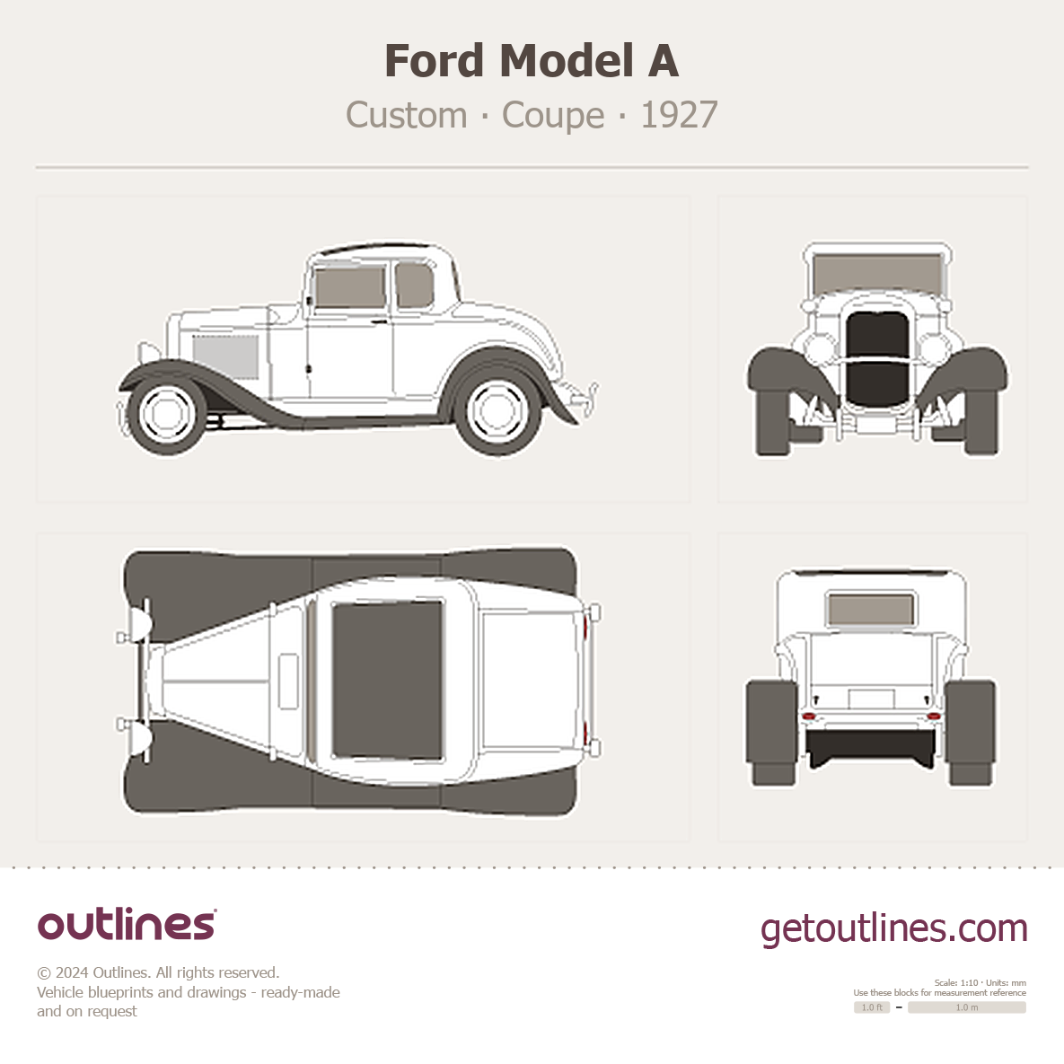 Buy this Ford Model A Custom blueprint and line drawing in high-quality editable vector file formats. Best for 3D and car wrap design.