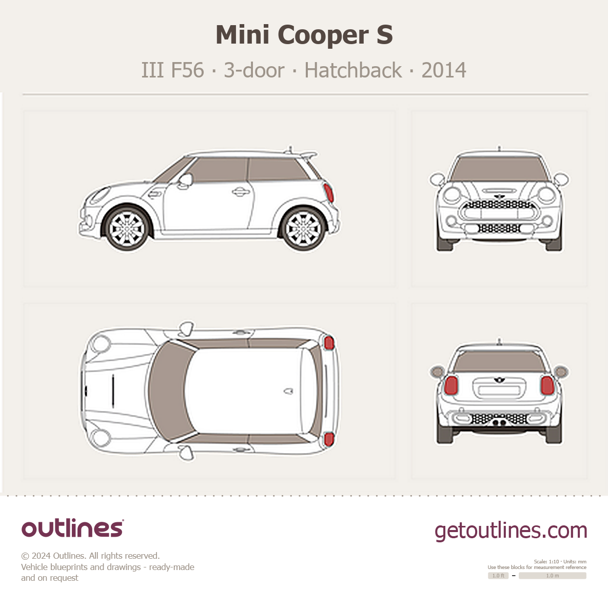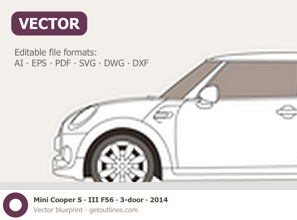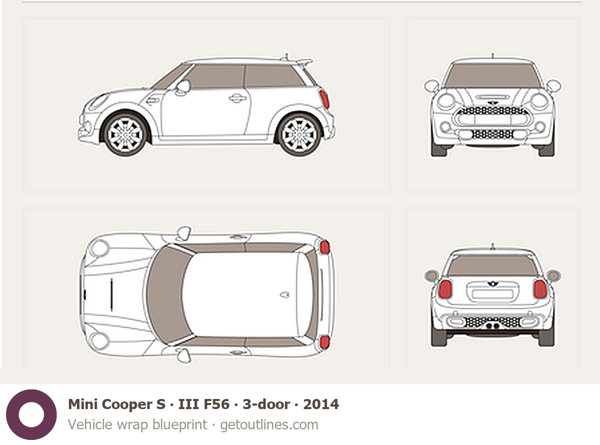This 2014 Mini Cooper S III F56 3-door Hatchback blueprint helps designers, wrap studios, and 3D artists simplify their workflow and save valuable time for creative work instead of routine tasks.