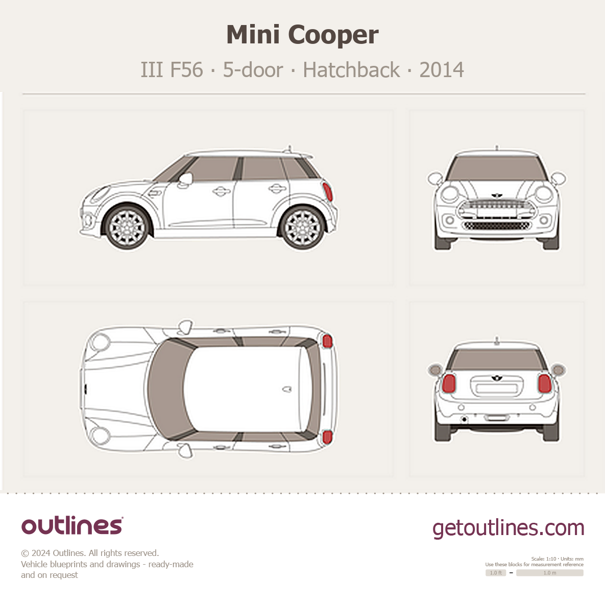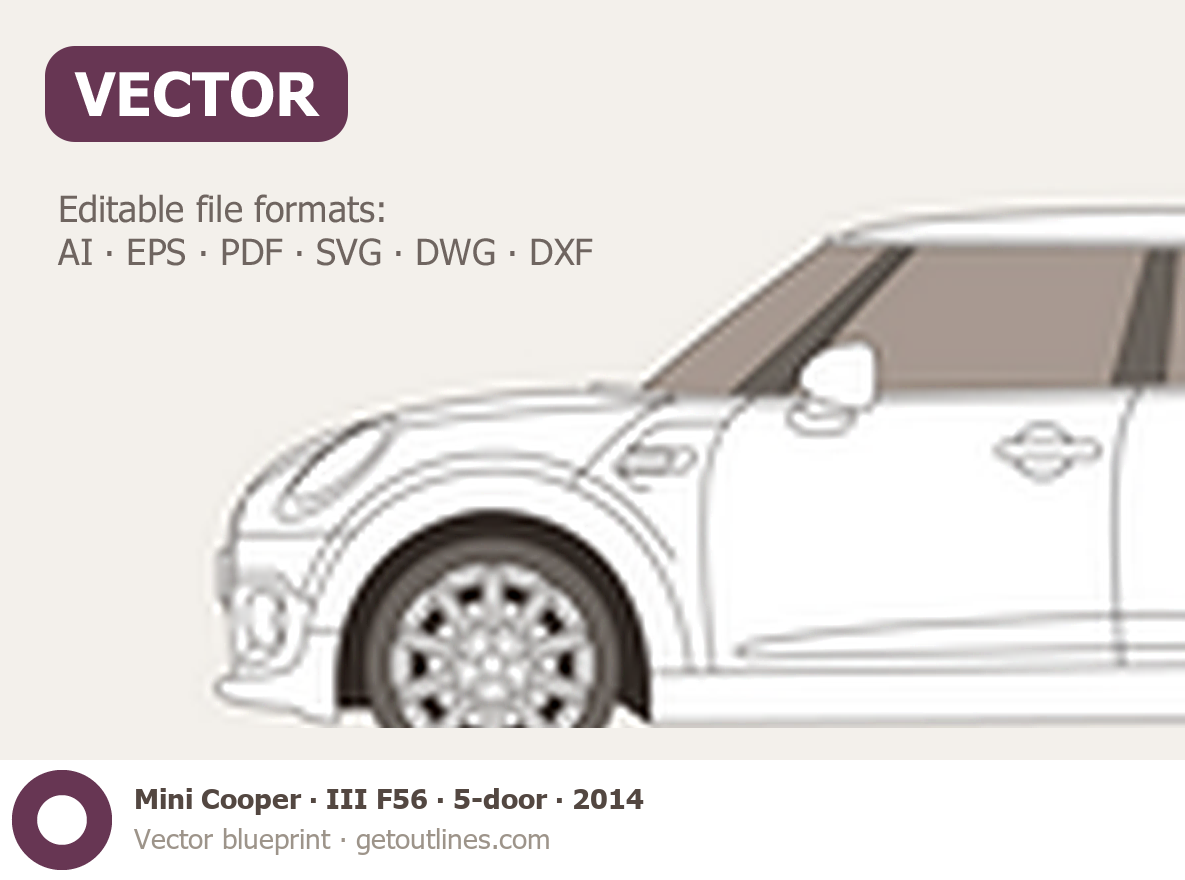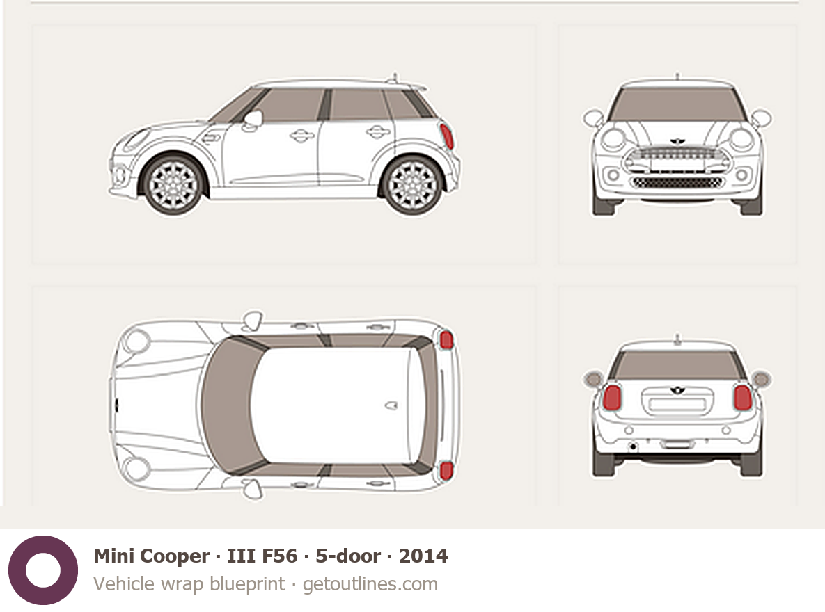 This 2014 Mini Cooper III F56 5-door Hatchback blueprint helps designers, wrap studios, and 3D artists simplify their workflow and save valuable time for creative work instead of routine tasks.