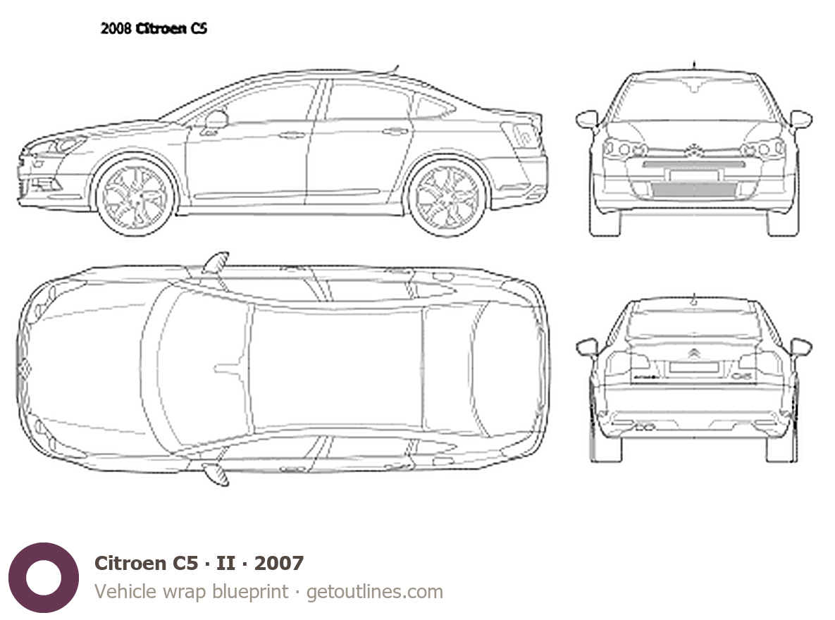 This 2007 Citroen C5 II Sedan blueprint helps designers, wrap studios, and 3D artists simplify their workflow and save valuable time for creative work instead of routine tasks.