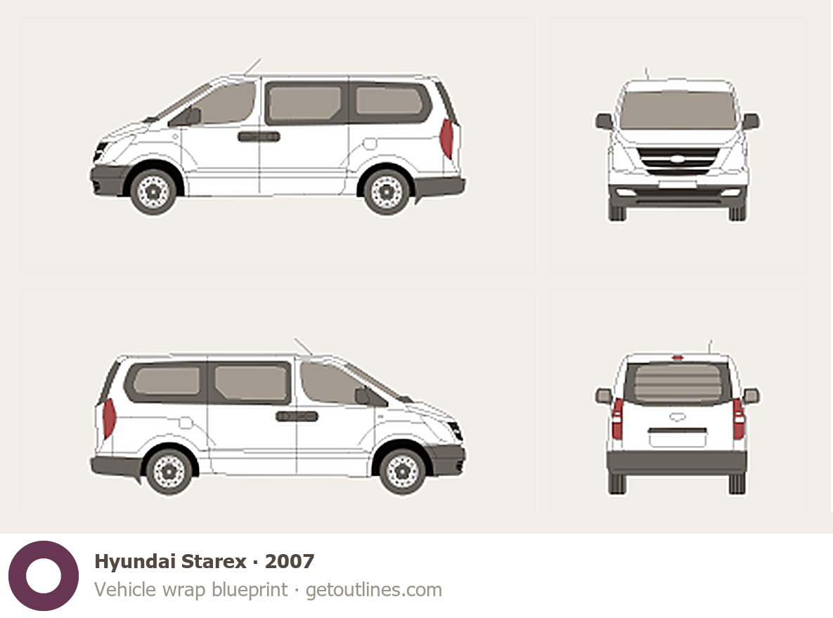 This template is suitable for Hyundai Starex models from 2007 to 2015, including 2007, 2008, 2009, 2010, and 2015 model years, and is commonly used for vehicle wrap and signage design.