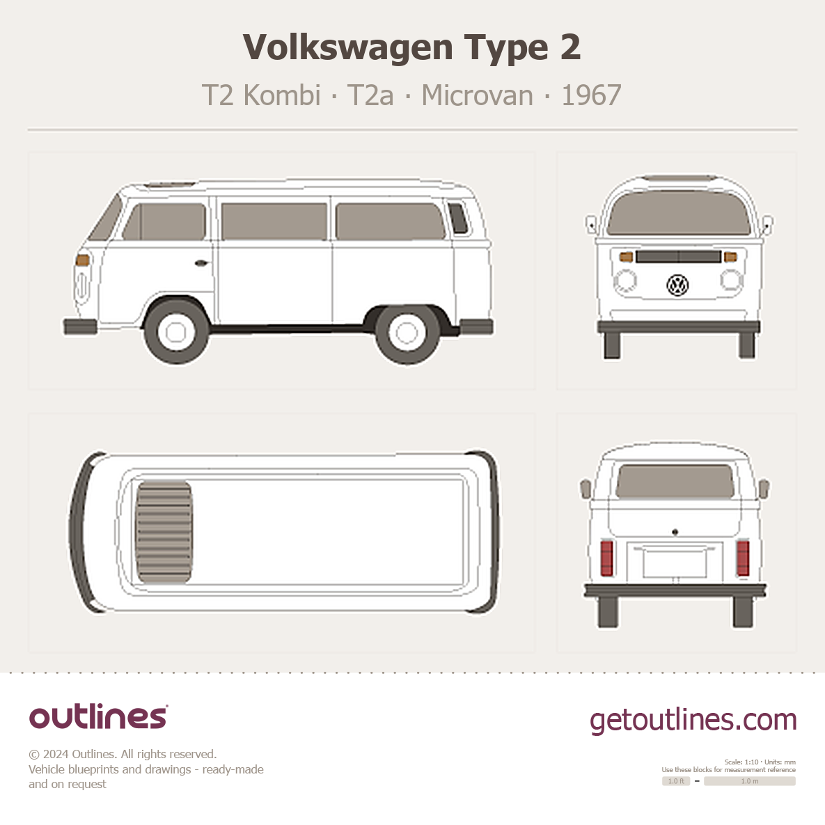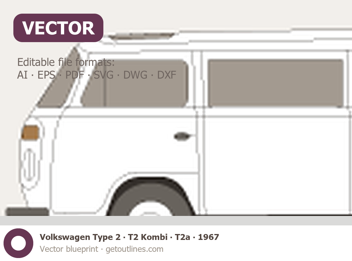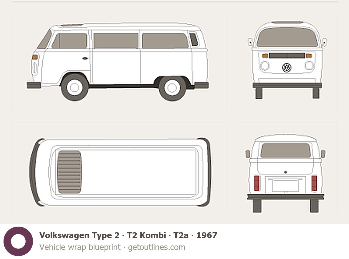 This 1967 Volkswagen Type 2 T2 Kombi T2a Microvan blueprint helps designers, wrap studios, and 3D artists simplify their workflow and save valuable time for creative work instead of routine tasks.