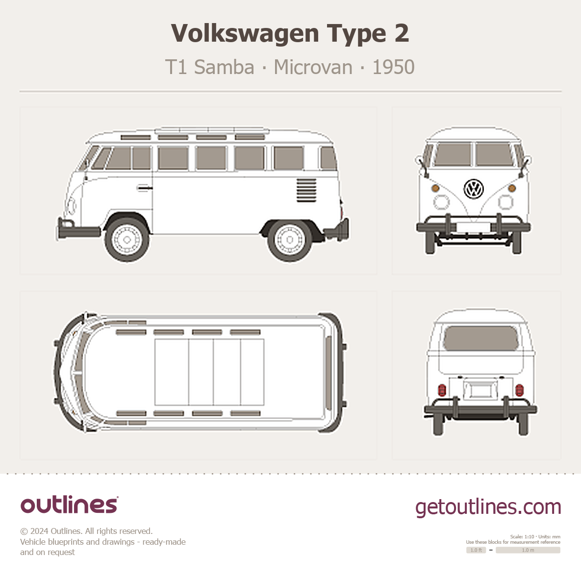This is a blueprint of the Type 2, produced by carmaker Volkswagen in 1950 - 1967. It features a Microvan body design and is classified as a Family vehicle.