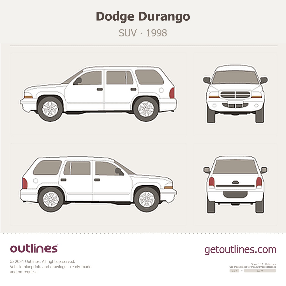 This is a blueprint of the Durango, produced by carmaker Dodge in 1998 - 2003. It features a SUV body design and is classified as a Offroad vehicle.