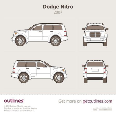 This is a blueprint of the Nitro, produced by carmaker Dodge in 2007 - 2012. It features a SUV body design and is classified as a Crossover vehicle.
