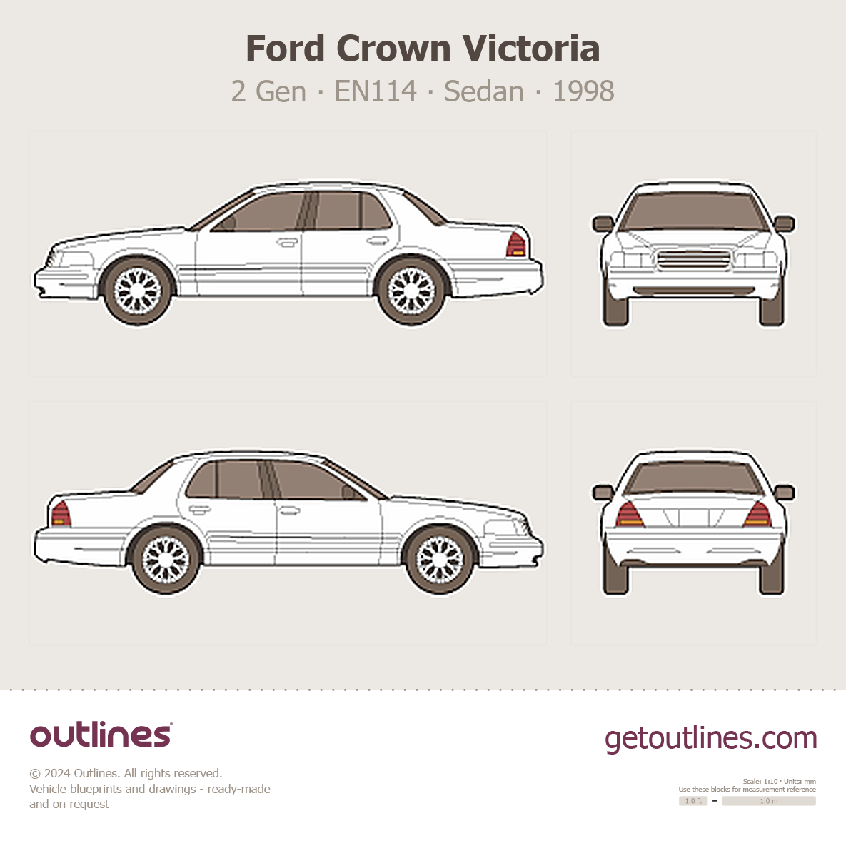 This is a blueprint of the Crown Victoria, produced by carmaker Ford in 1998 - 2012. It features a Sedan body design and is classified as a Family vehicle.