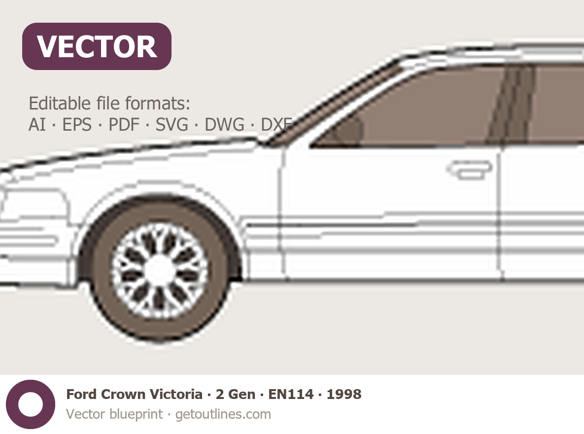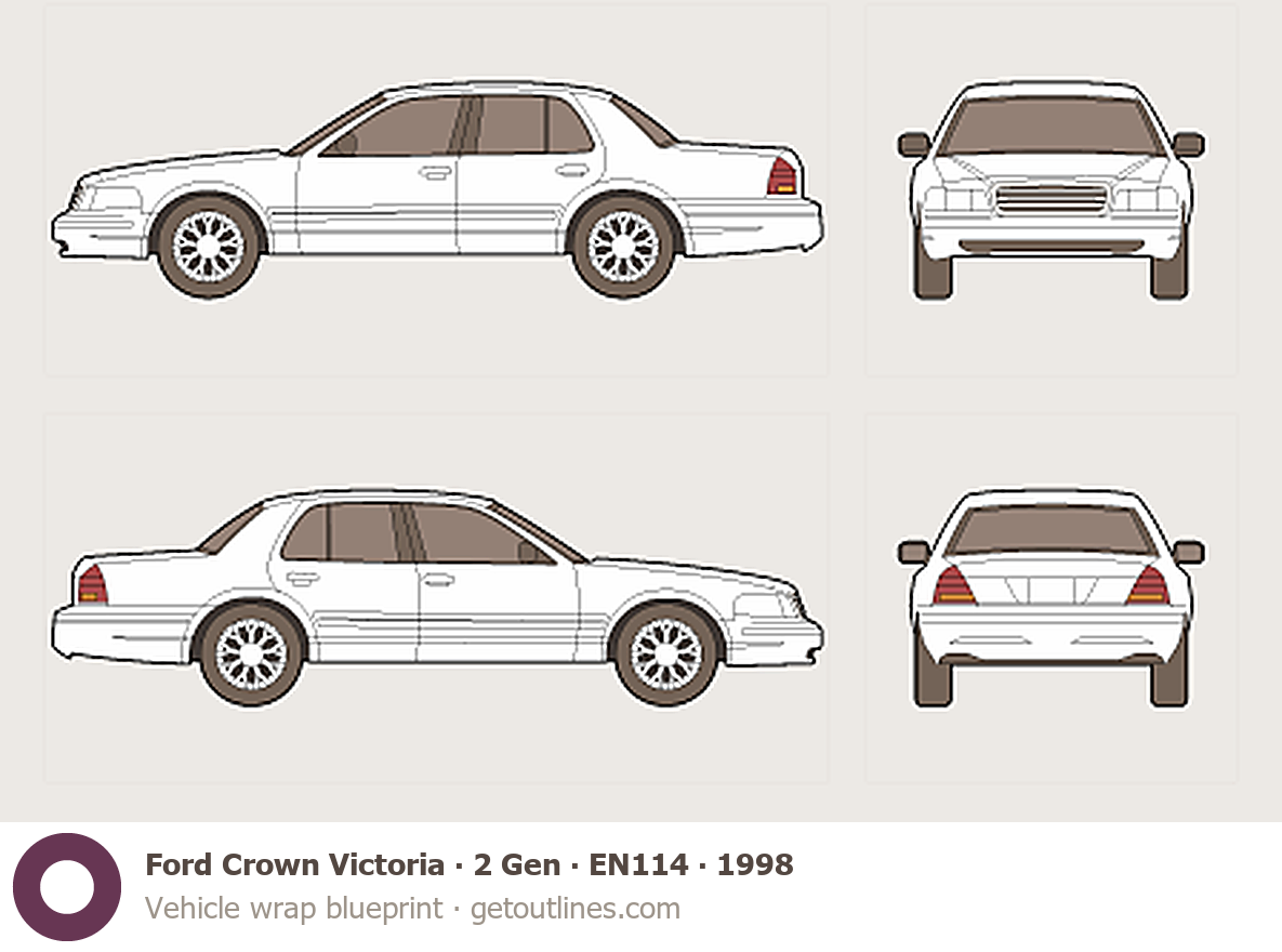 This 1998 Ford Crown Victoria 2 Gen ∙ EN114 Sedan blueprint helps designers, wrap studios, and 3D artists simplify their workflow and save valuable time for creative work instead of routine tasks.