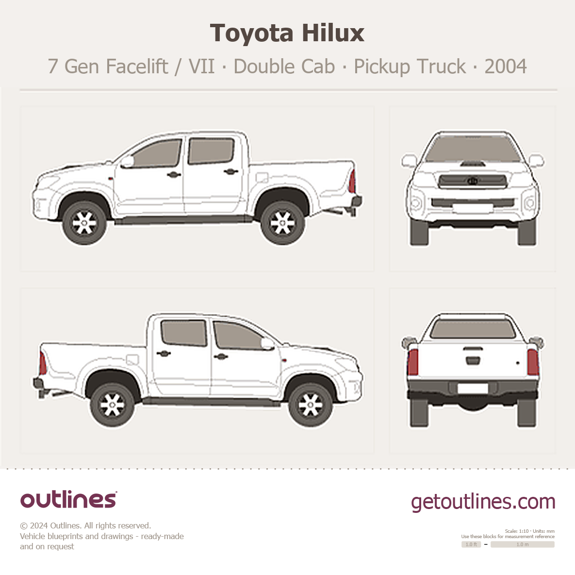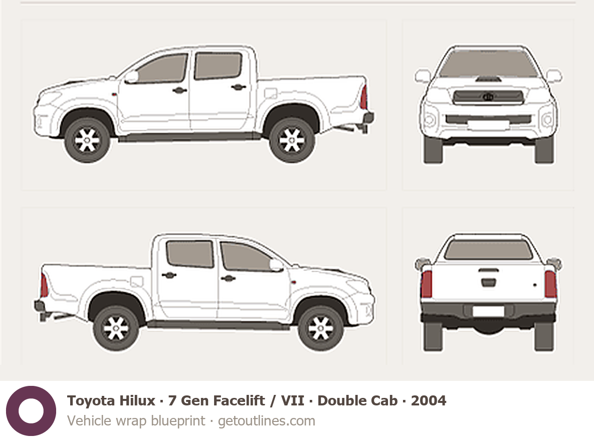 This 2004 Toyota Hilux 7 Gen Facelift / VII Double Cab Pickup Truck blueprint helps designers, wrap studios, and 3D artists simplify their workflow and save valuable time for creative work instead of routine tasks.