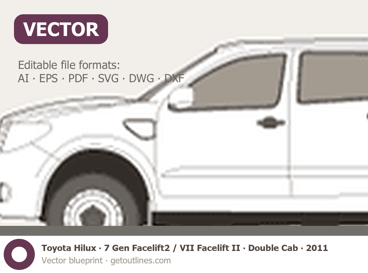 Buy this Toyota Hilux 7 Gen Facelift2 / VII Facelift II blueprint and line drawing in high-quality editable vector file formats. Best for 3D and car wrap design.