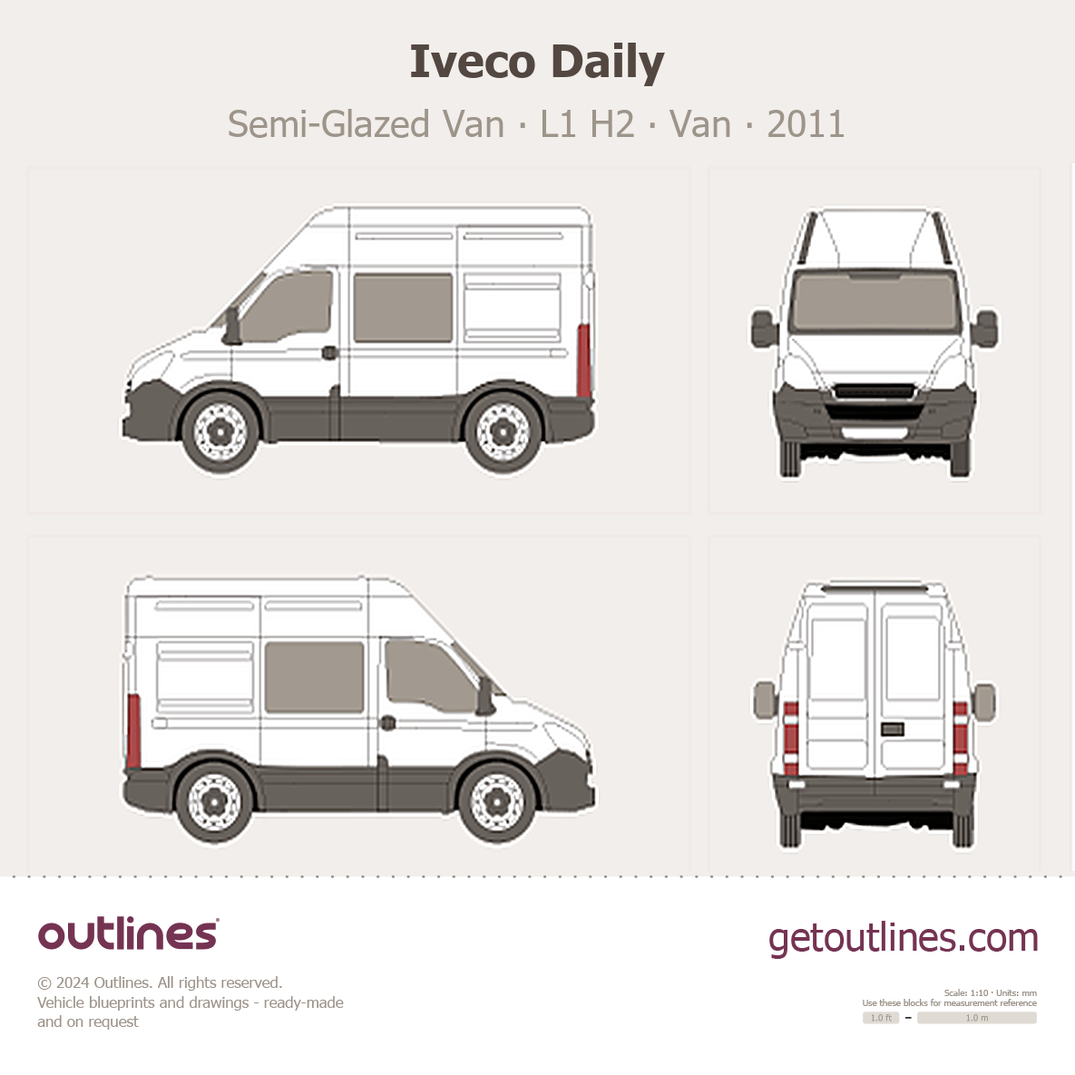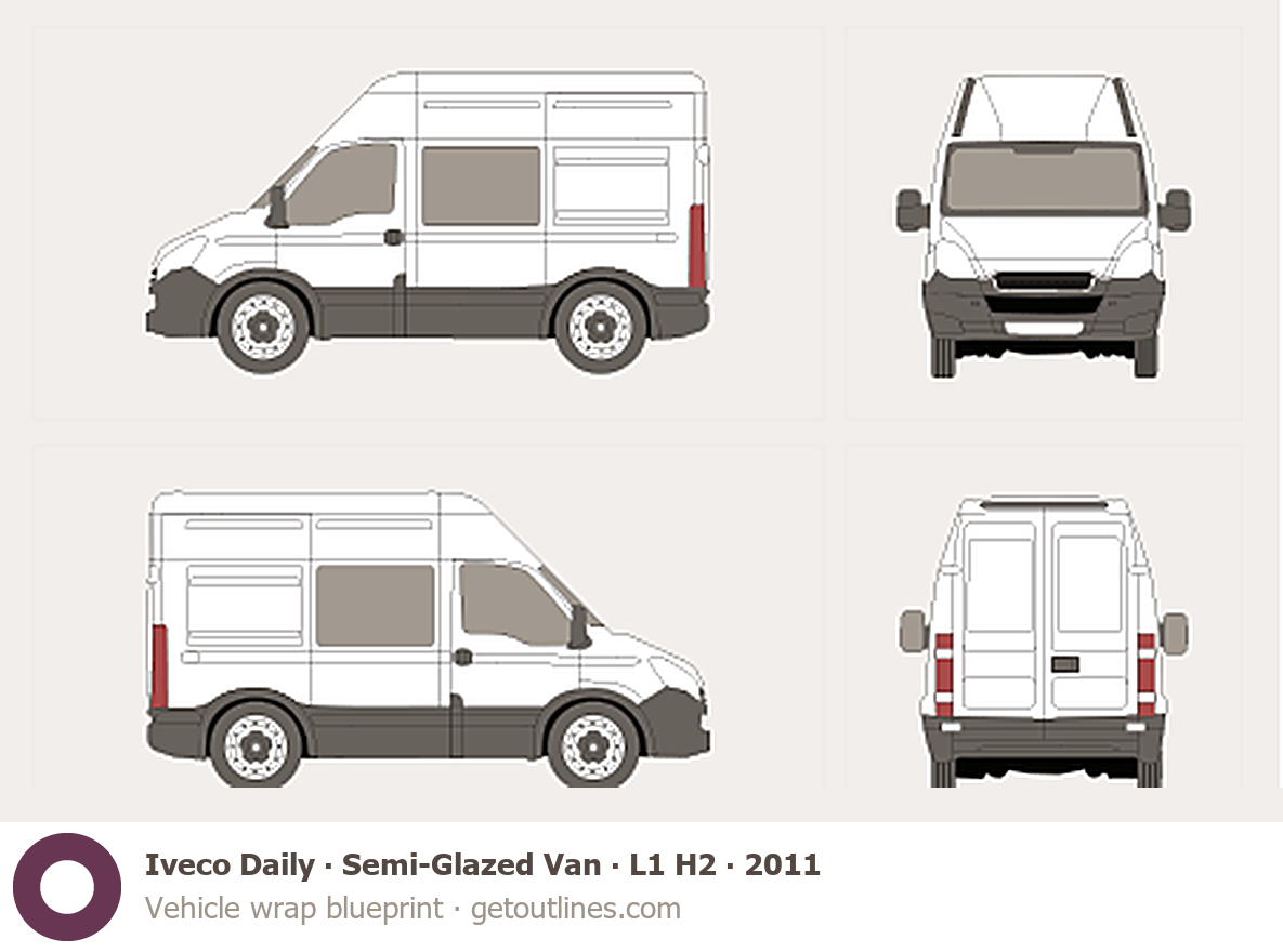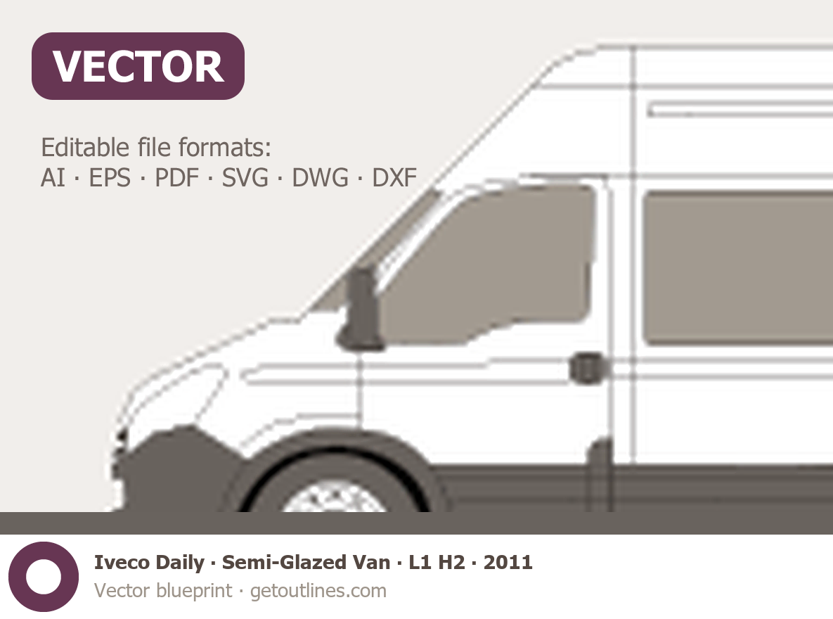 Buy this Iveco Daily Semi-Glazed Van blueprint and line drawing in high-quality editable vector file formats. Best for 3D and car wrap design.