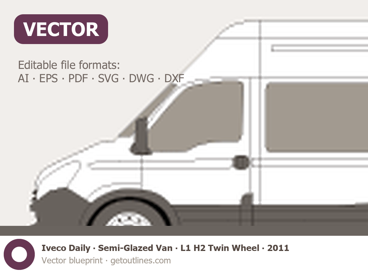 Buy this Iveco Daily Semi-Glazed Van blueprint and line drawing in high-quality editable vector file formats. Best for 3D and car wrap design.