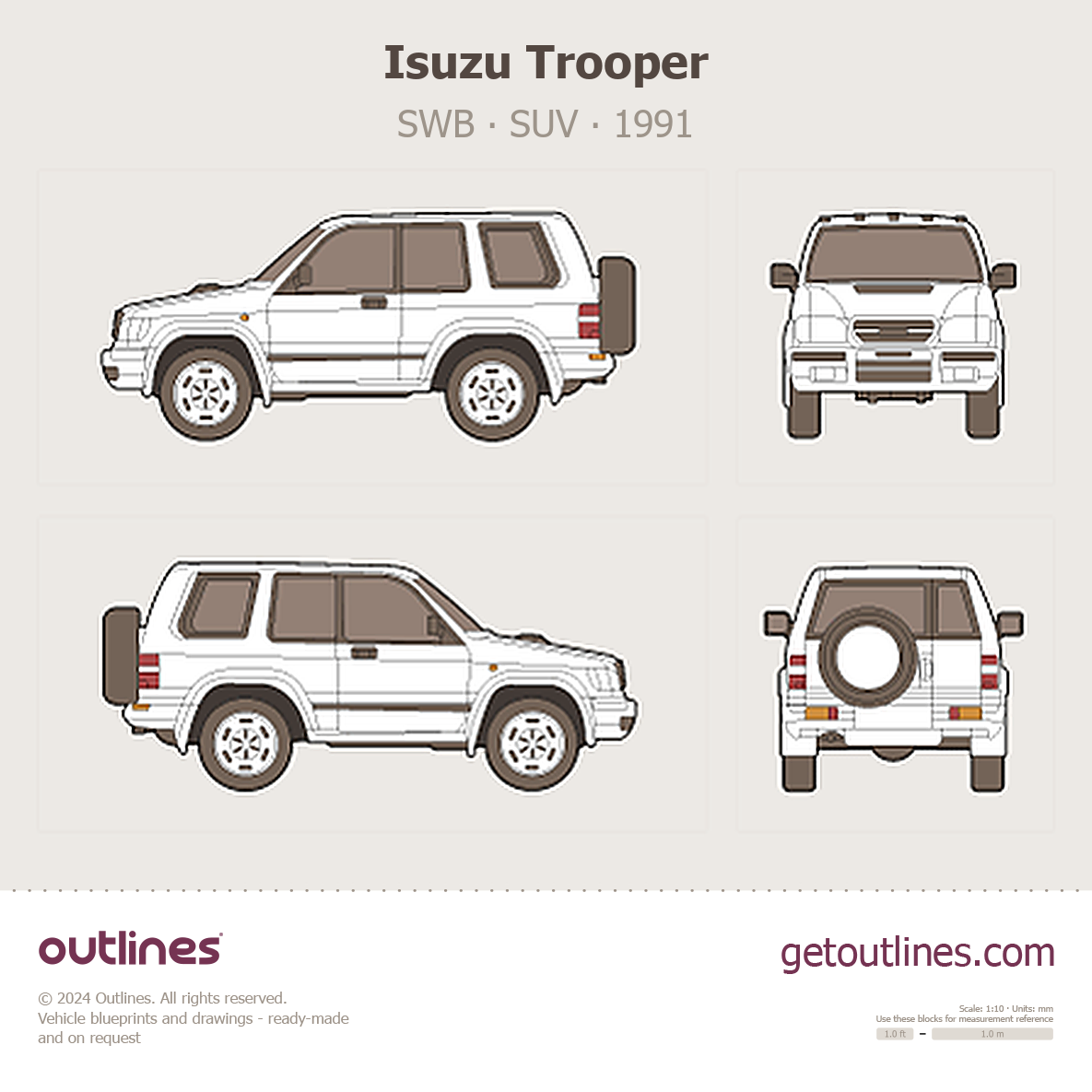 This is a blueprint of the Trooper, produced by carmaker Isuzu in 1991 - 2002. It features a SUV body design and is classified as a Offroad vehicle.