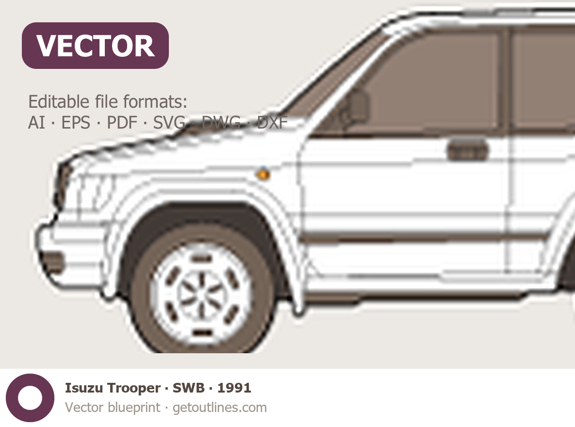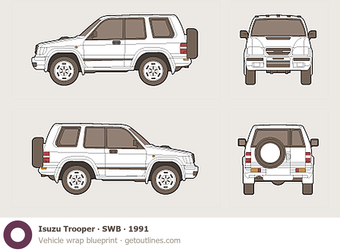This 1991 Isuzu Trooper SWB SUV blueprint helps designers, wrap studios, and 3D artists simplify their workflow and save valuable time for creative work instead of routine tasks.