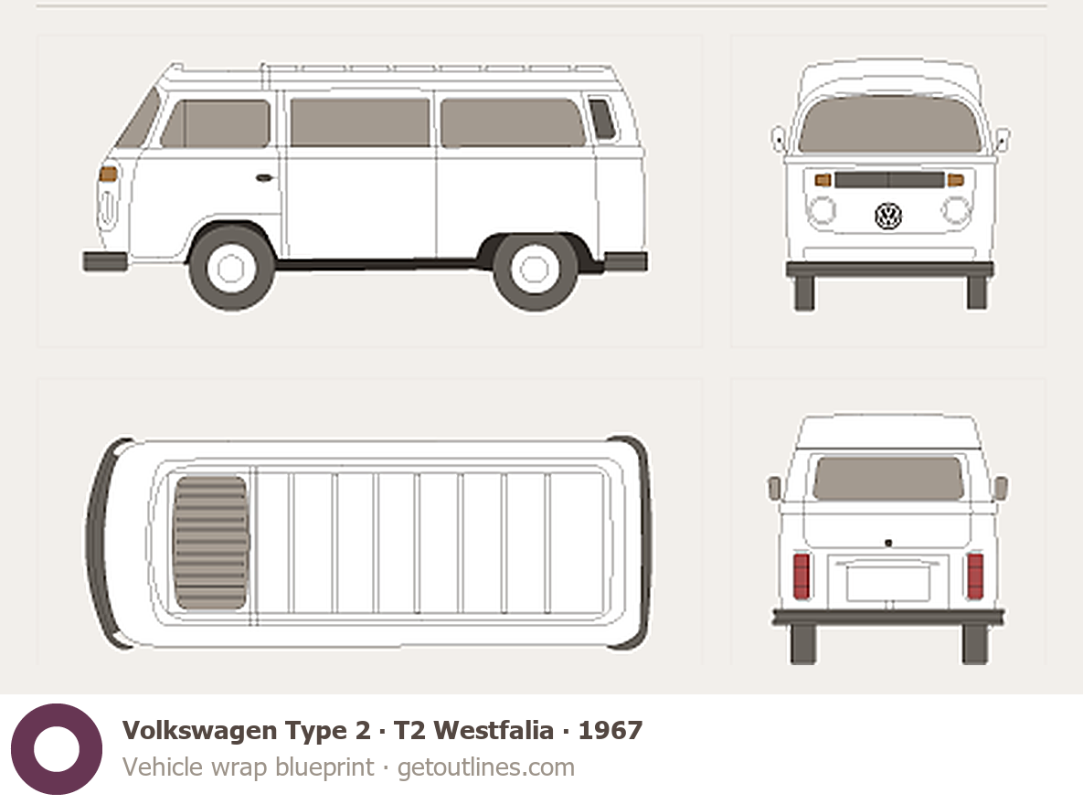 This 1967 Volkswagen Type 2 T2 Westfalia Microvan blueprint helps designers, wrap studios, and 3D artists simplify their workflow and save valuable time for creative work instead of routine tasks.