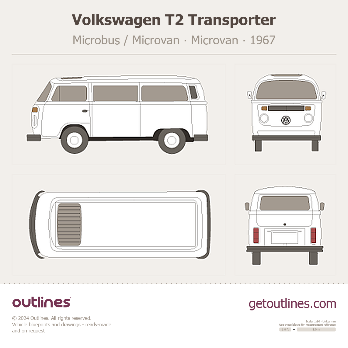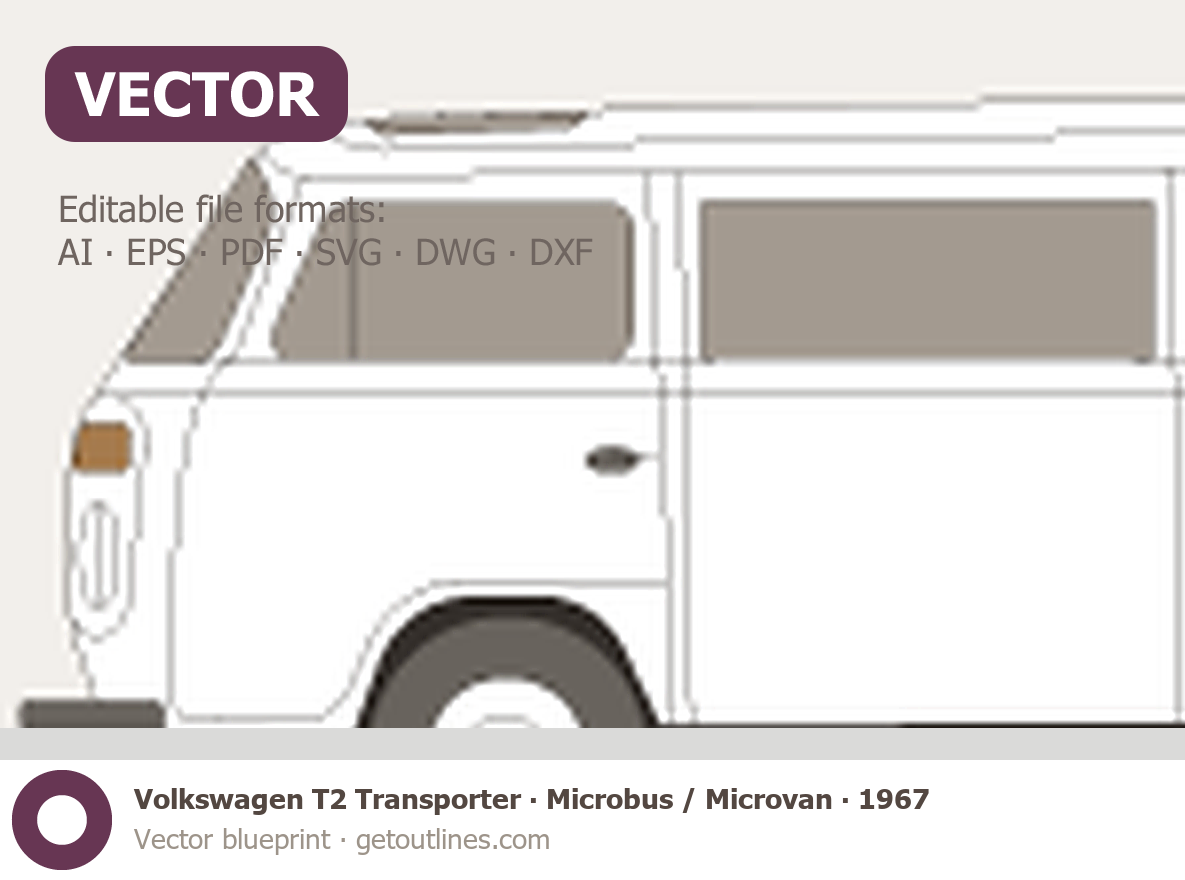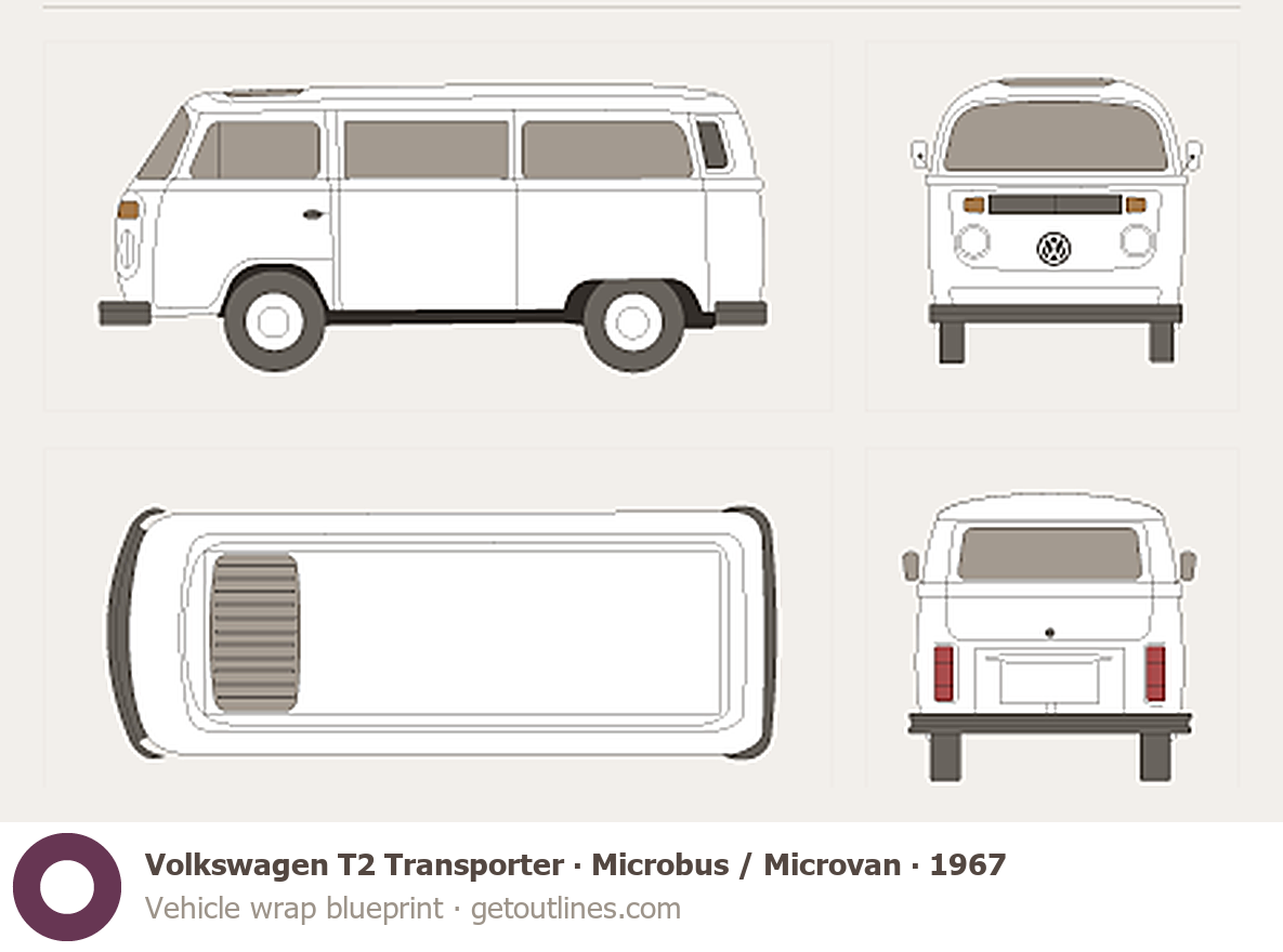 This 1967 Volkswagen T2 Transporter Microbus / Microvan Microvan blueprint helps designers, wrap studios, and 3D artists simplify their workflow and save valuable time for creative work instead of routine tasks.