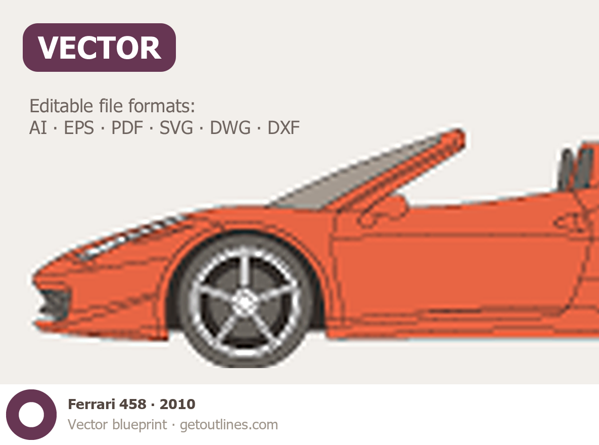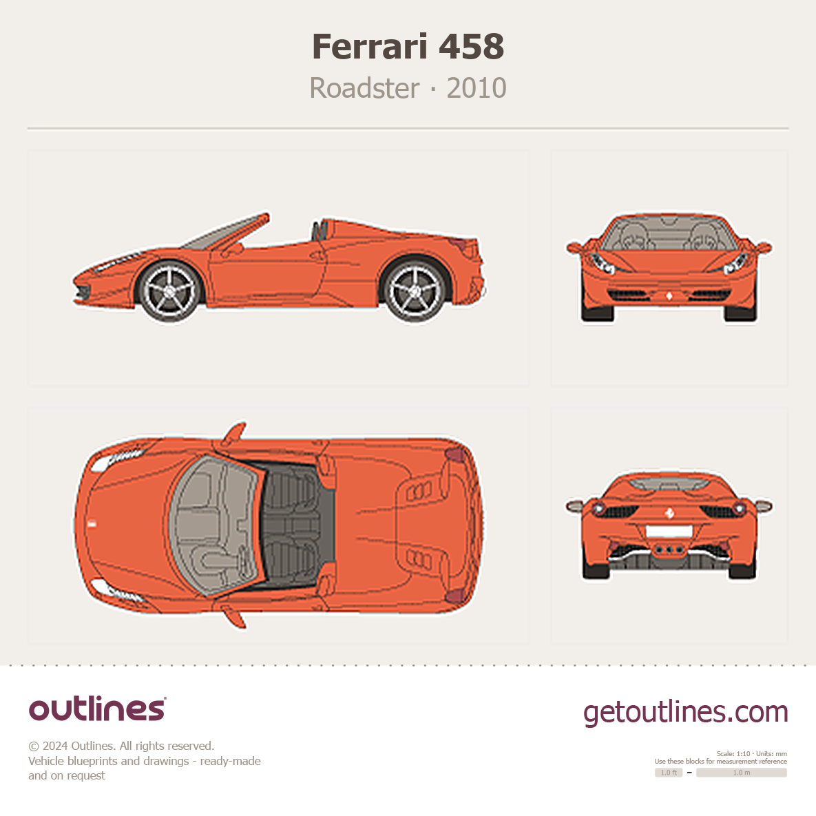 This is a blueprint of the 458, produced by carmaker Ferrari in 2010 - 2015. It features a Roadster body design and is classified as a Sports car vehicle.
