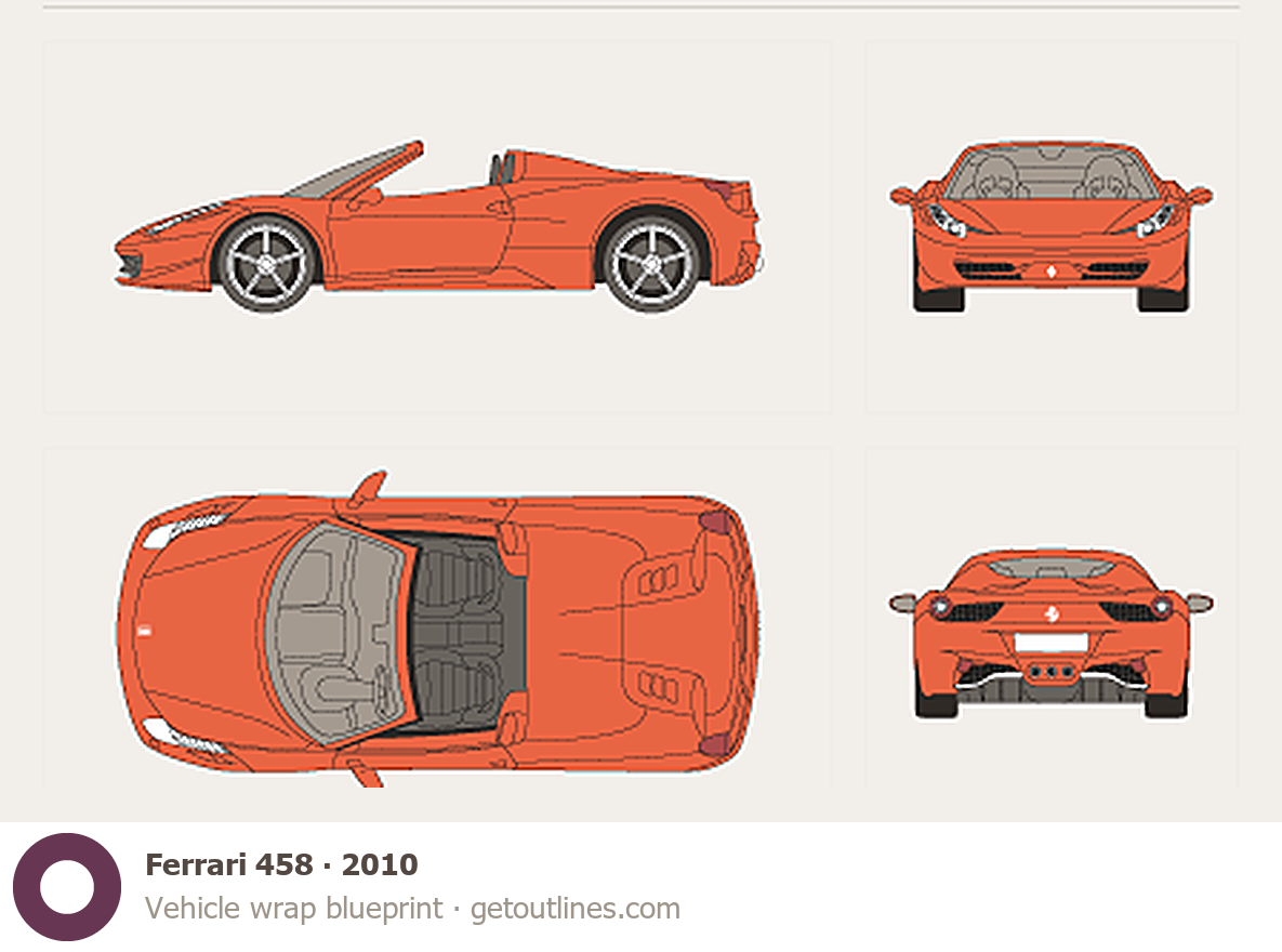 This 2010 Ferrari 458 Roadster blueprint helps designers, wrap studios, and 3D artists simplify their workflow and save valuable time for creative work instead of routine tasks.