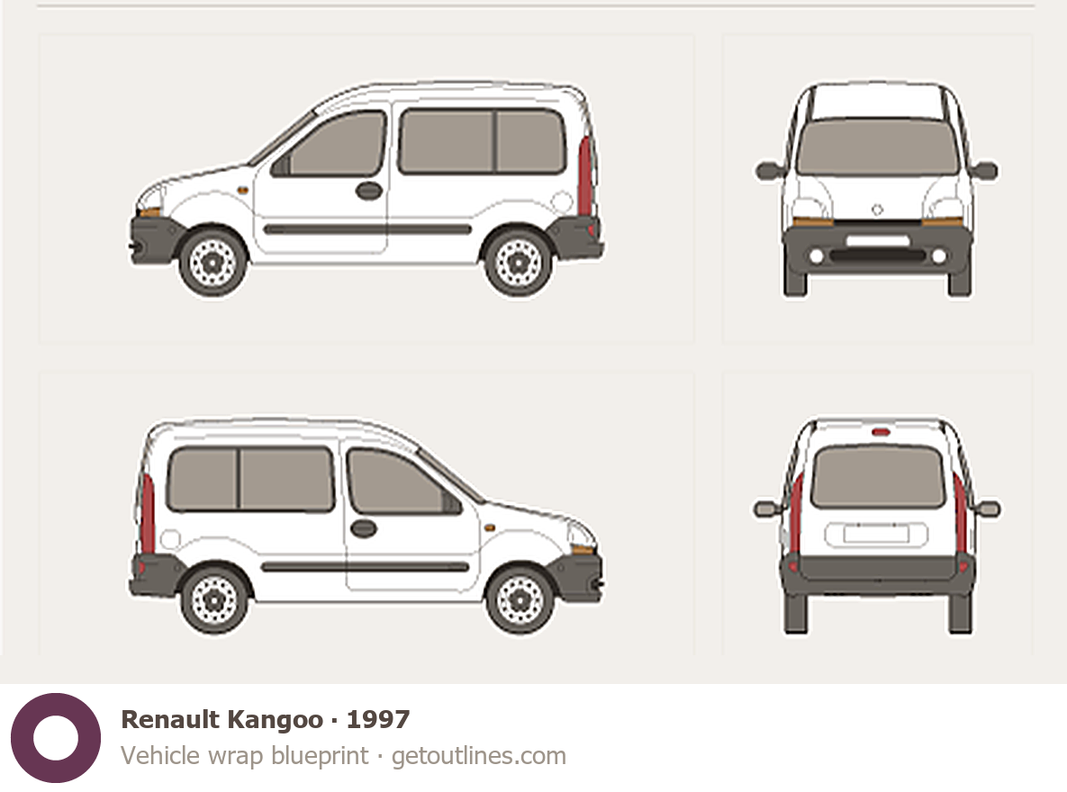 This template is suitable for Renault Kangoo models from 1997 to 2003, including 1997, 1998, 1999, 2000, and 2003 model years, and is commonly used for vehicle wrap and signage design.