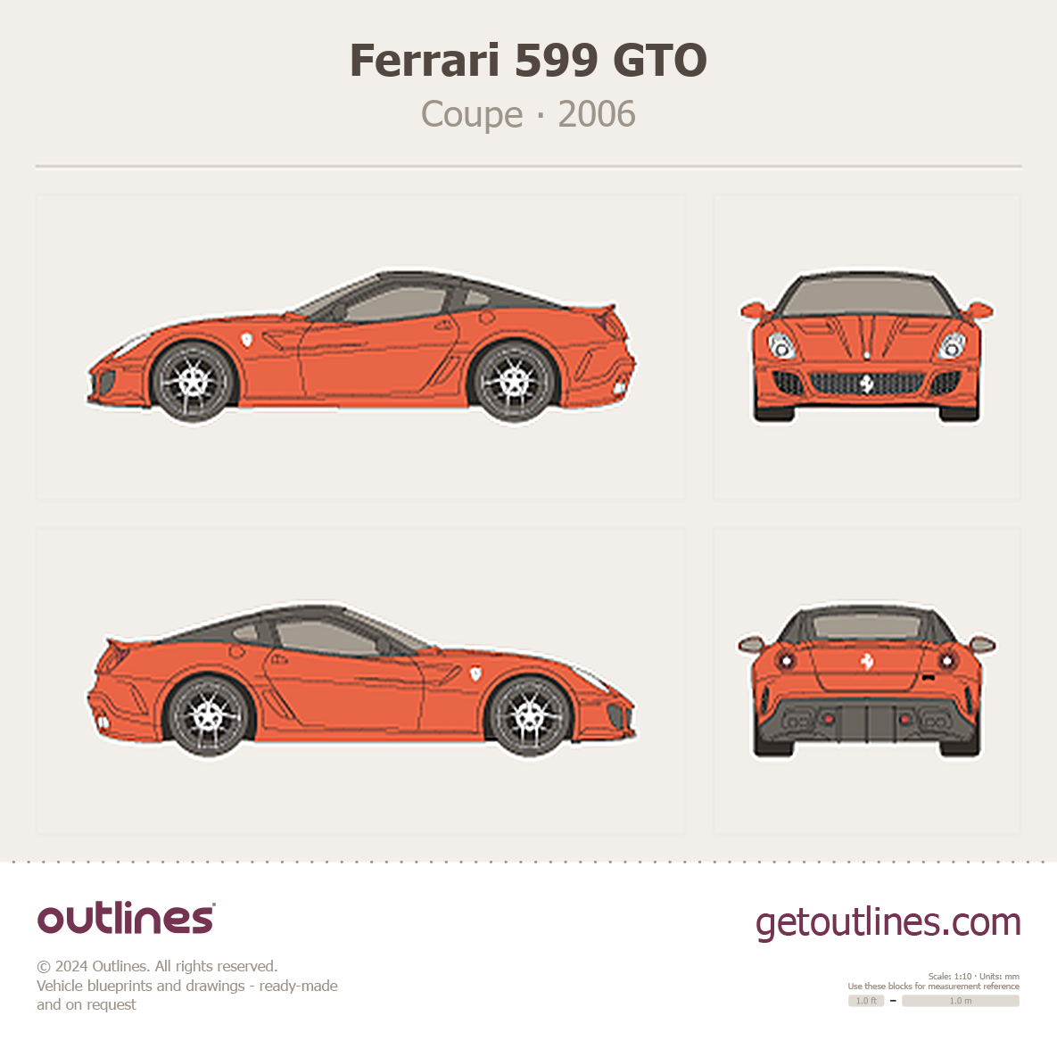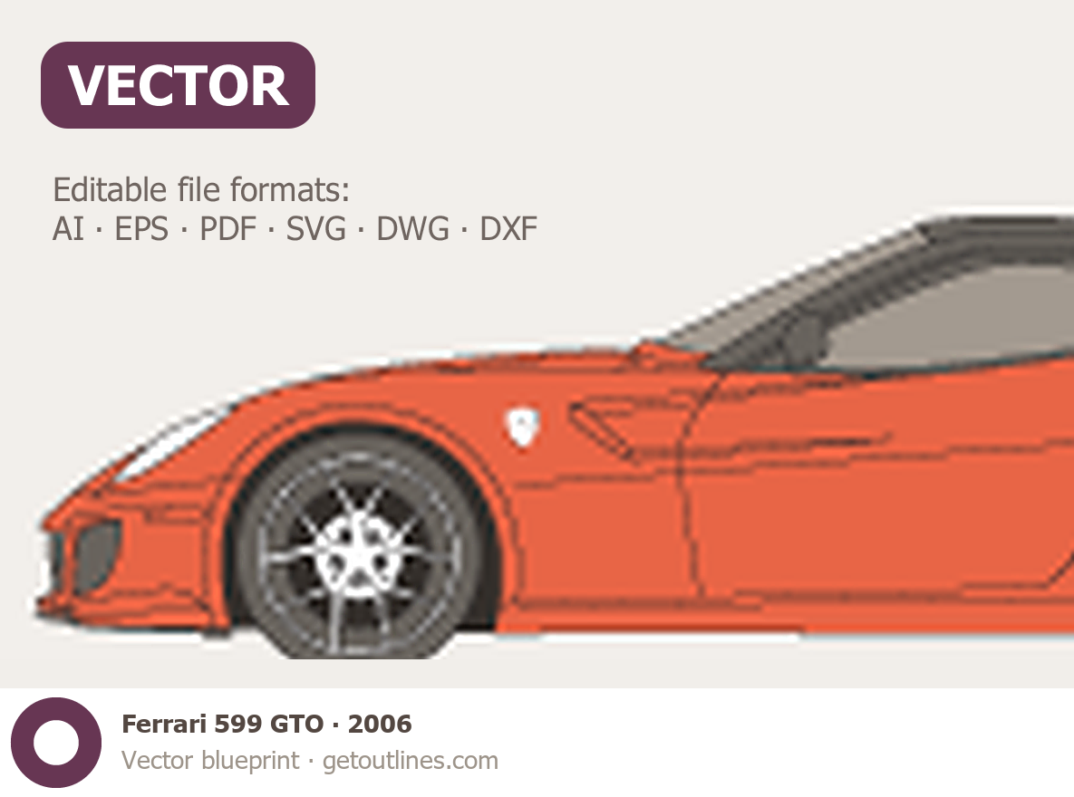 This is a blueprint of the 599 GTO, produced by carmaker Ferrari in 2006 - 2016. It features a Coupe body design and is classified as a Supercar vehicle.