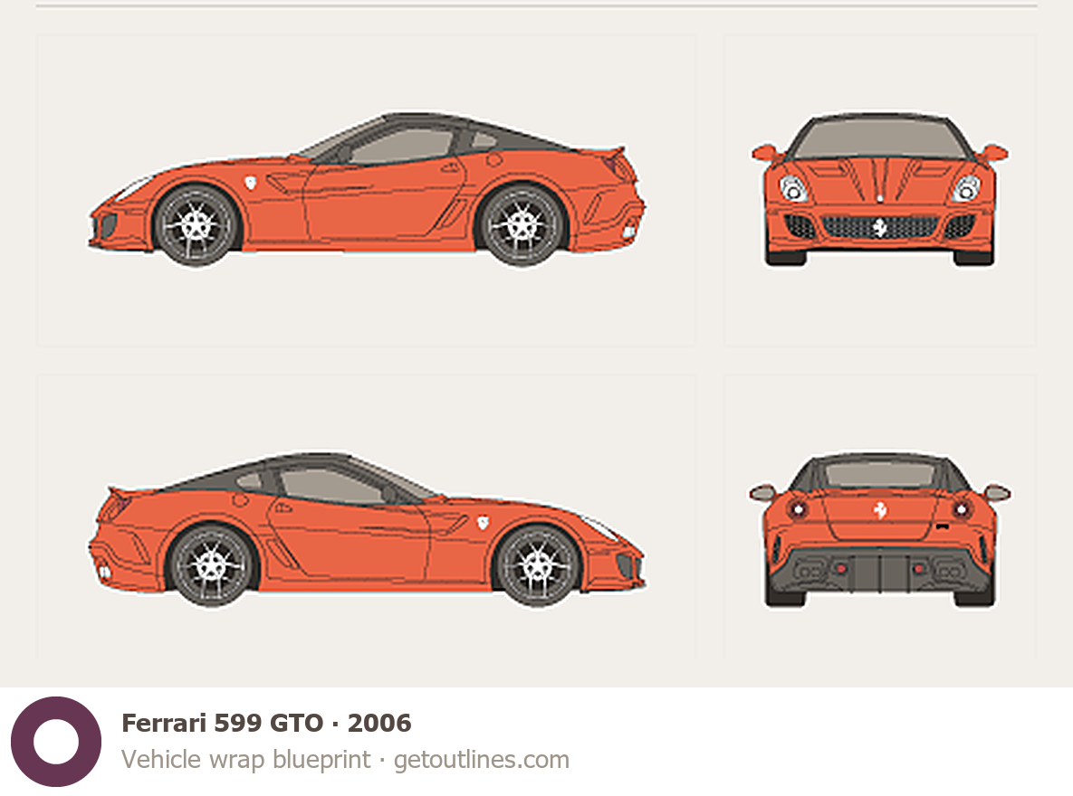 This 2006 Ferrari 599 GTO Coupe blueprint helps designers, wrap studios, and 3D artists simplify their workflow and save valuable time for creative work instead of routine tasks.