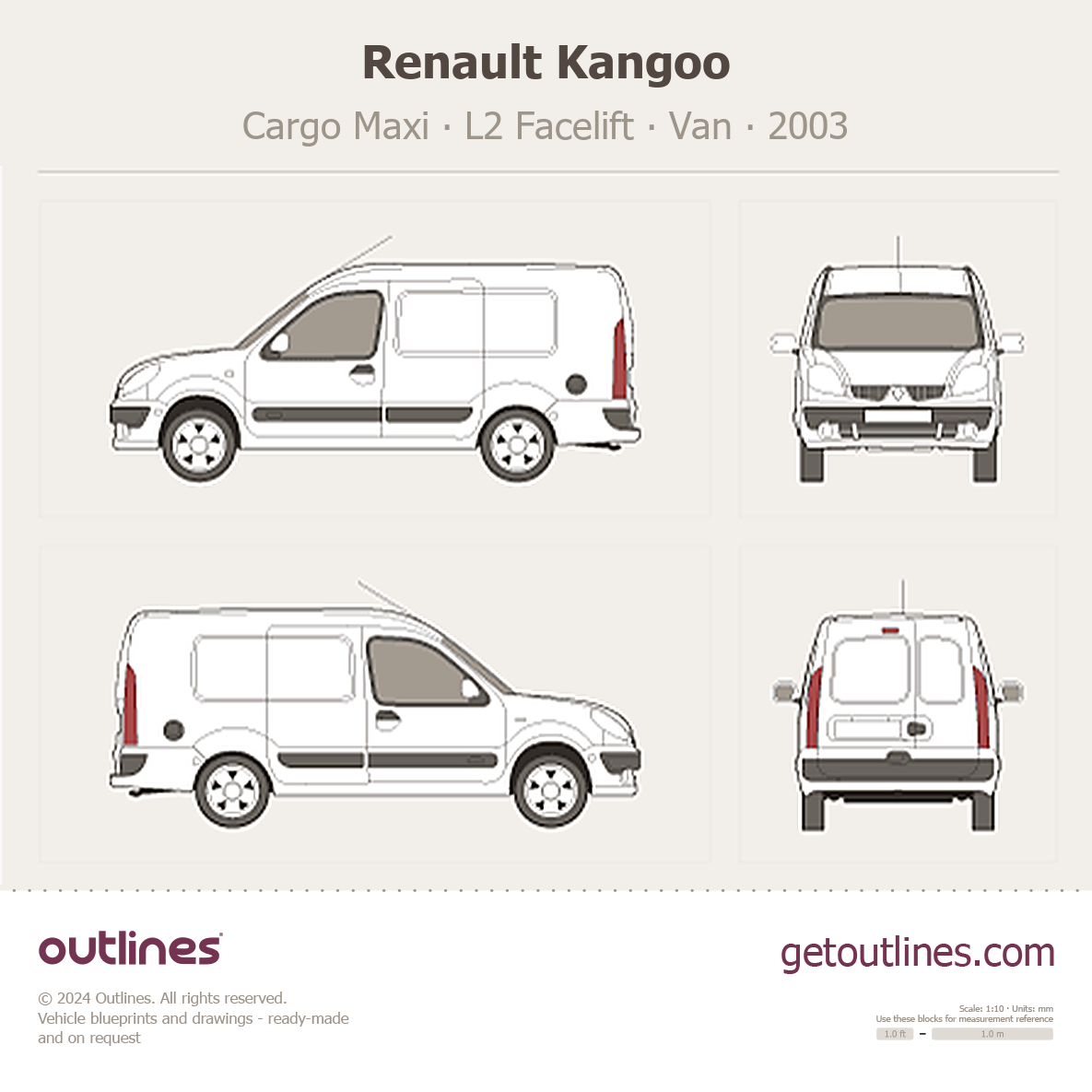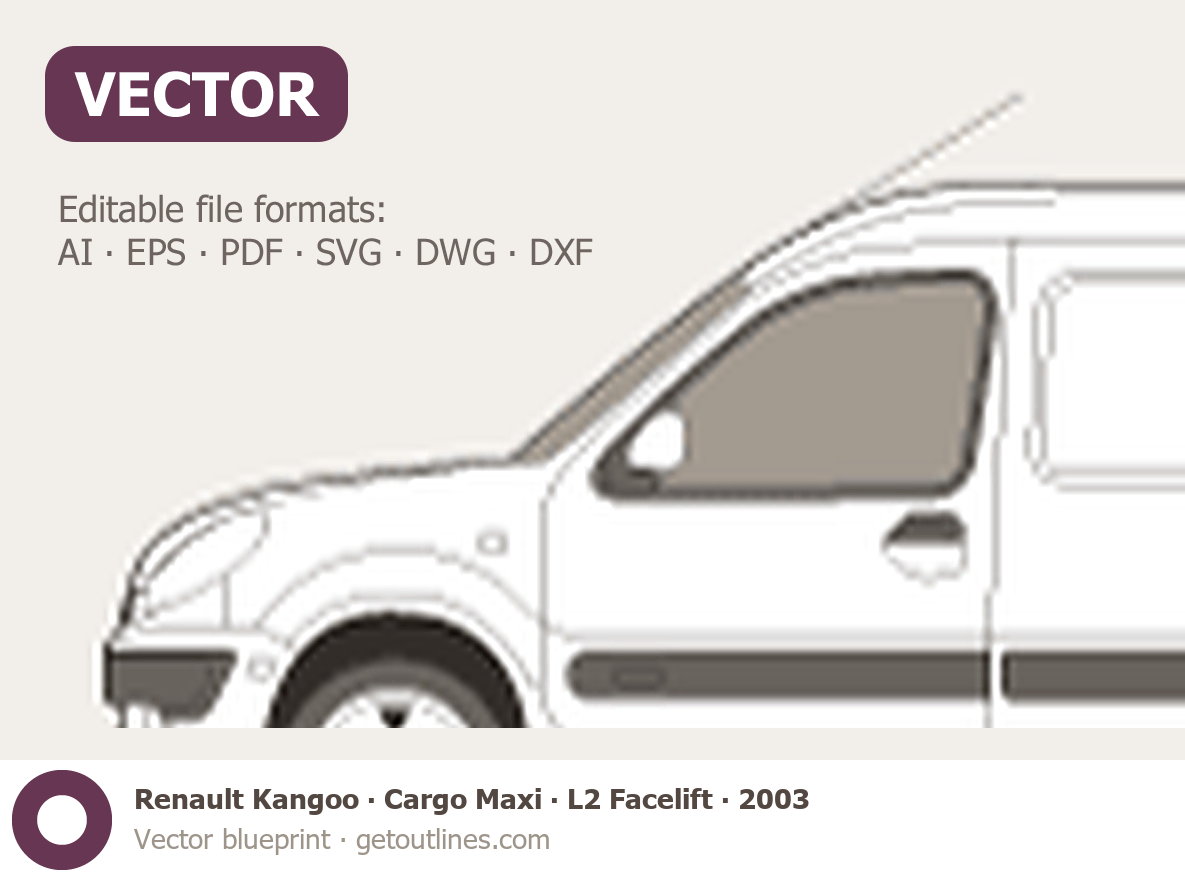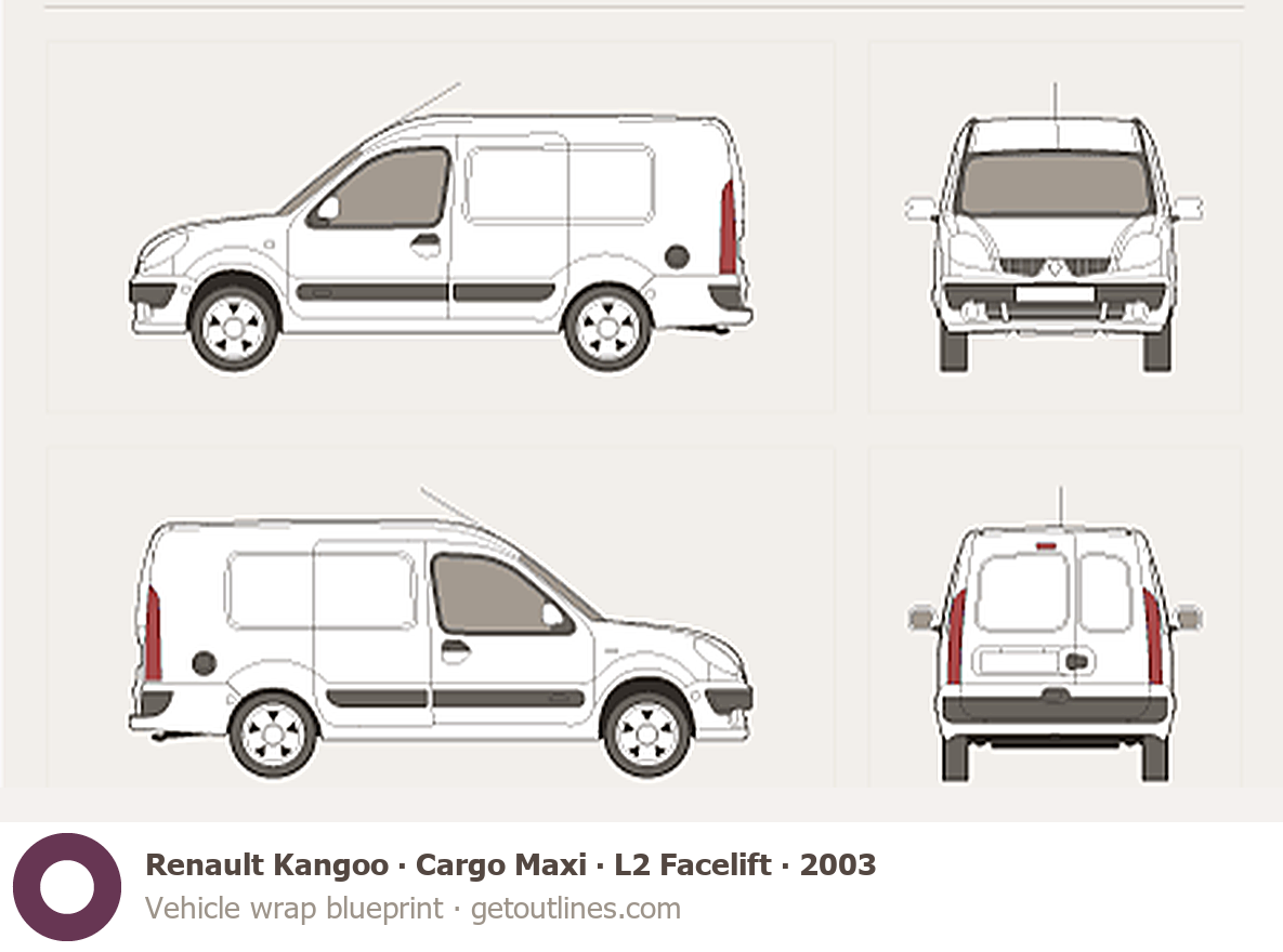 This 2003 Renault Kangoo Cargo Maxi L2 Facelift Van blueprint helps designers, wrap studios, and 3D artists simplify their workflow and save valuable time for creative work instead of routine tasks.