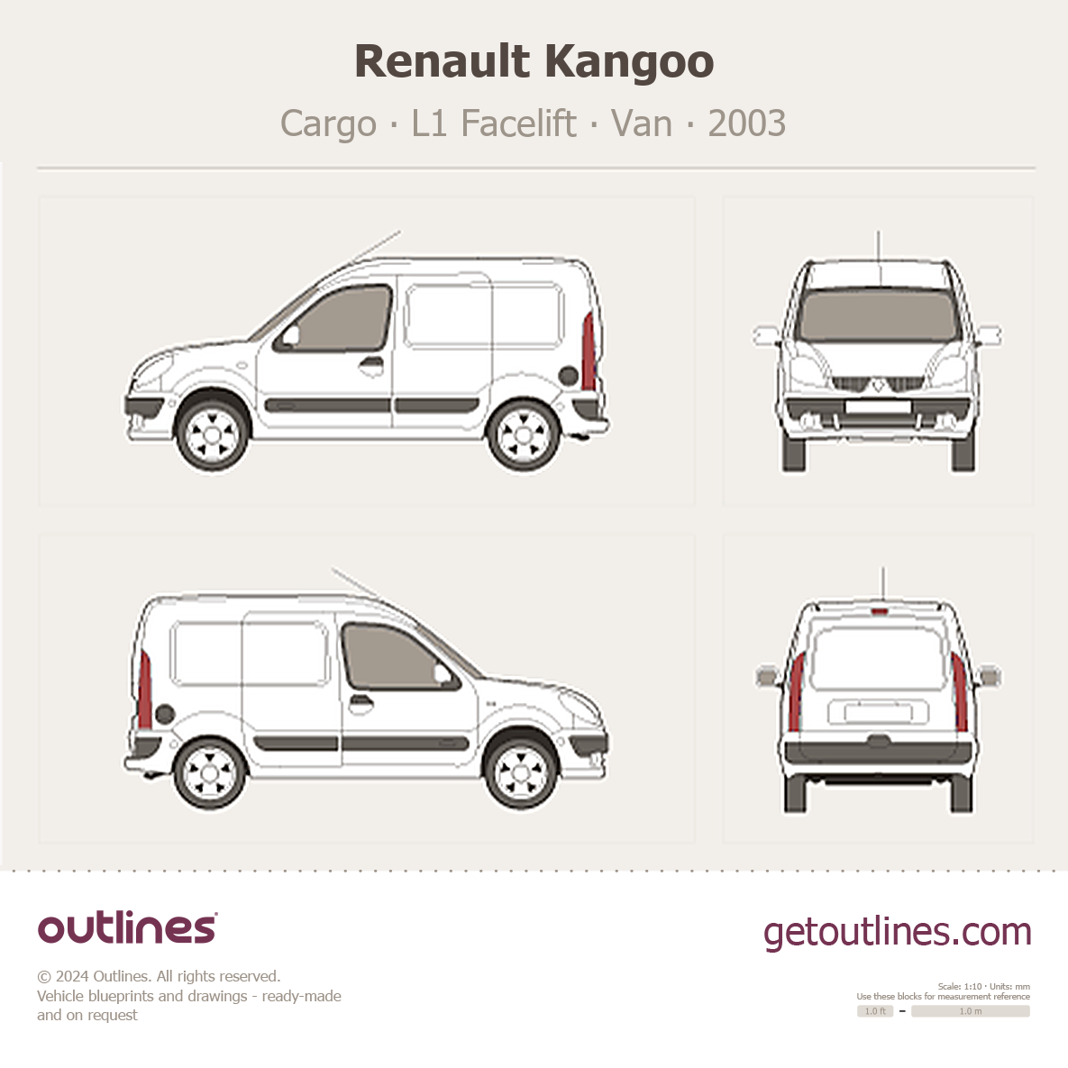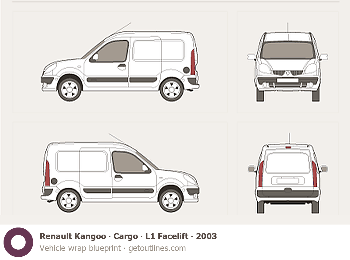 This 2003 Renault Kangoo Cargo L1 Facelift Van blueprint helps designers, wrap studios, and 3D artists simplify their workflow and save valuable time for creative work instead of routine tasks.
