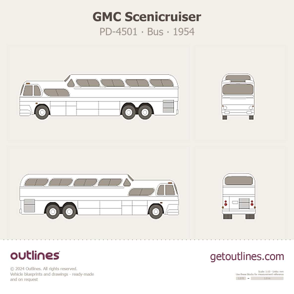 This is a blueprint of the Scenicruiser, produced by carmaker GMC in 1954 - 1960. It features a Bus body design and is classified as a Commercial vehicle.