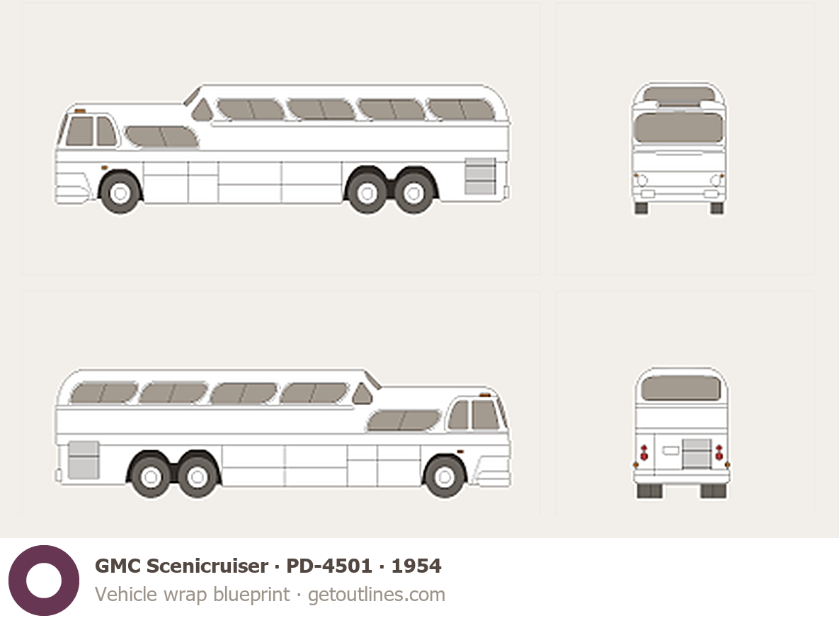 This template is suitable for GMC Scenicruiser models from 1954 to 1960, including 1954, 1955, 1956, 1957, and 1960 model years, and is commonly used for vehicle wrap and signage design.