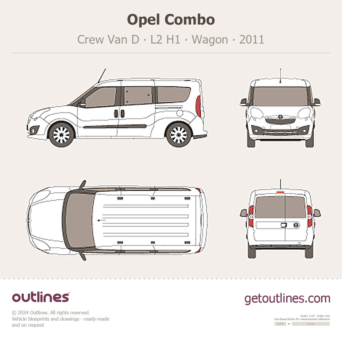This 2011 Opel Combo Crew Van D L2 H1 Wagon blueprint helps designers, wrap studios, and 3D artists simplify their workflow and save valuable time for creative work instead of routine tasks.