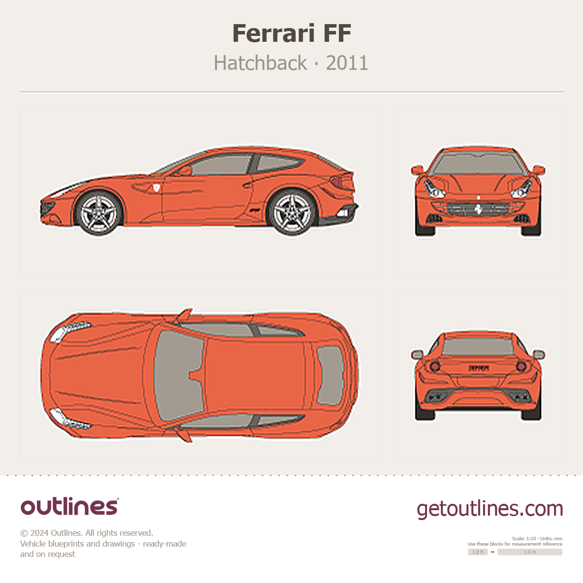 This is a blueprint of the FF, produced by carmaker Ferrari in 2011 - 2016. It features a Hatchback body design and is classified as a Sports car vehicle.