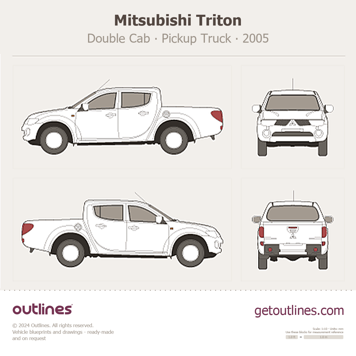 This 2005 Mitsubishi Triton Double Cab Pickup Truck blueprint helps designers, wrap studios, and 3D artists simplify their workflow and save valuable time for creative work instead of routine tasks.