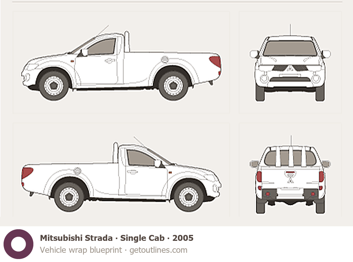 This 2005 Mitsubishi Strada Single Cab Pickup Truck blueprint helps designers, wrap studios, and 3D artists simplify their workflow and save valuable time for creative work instead of routine tasks.