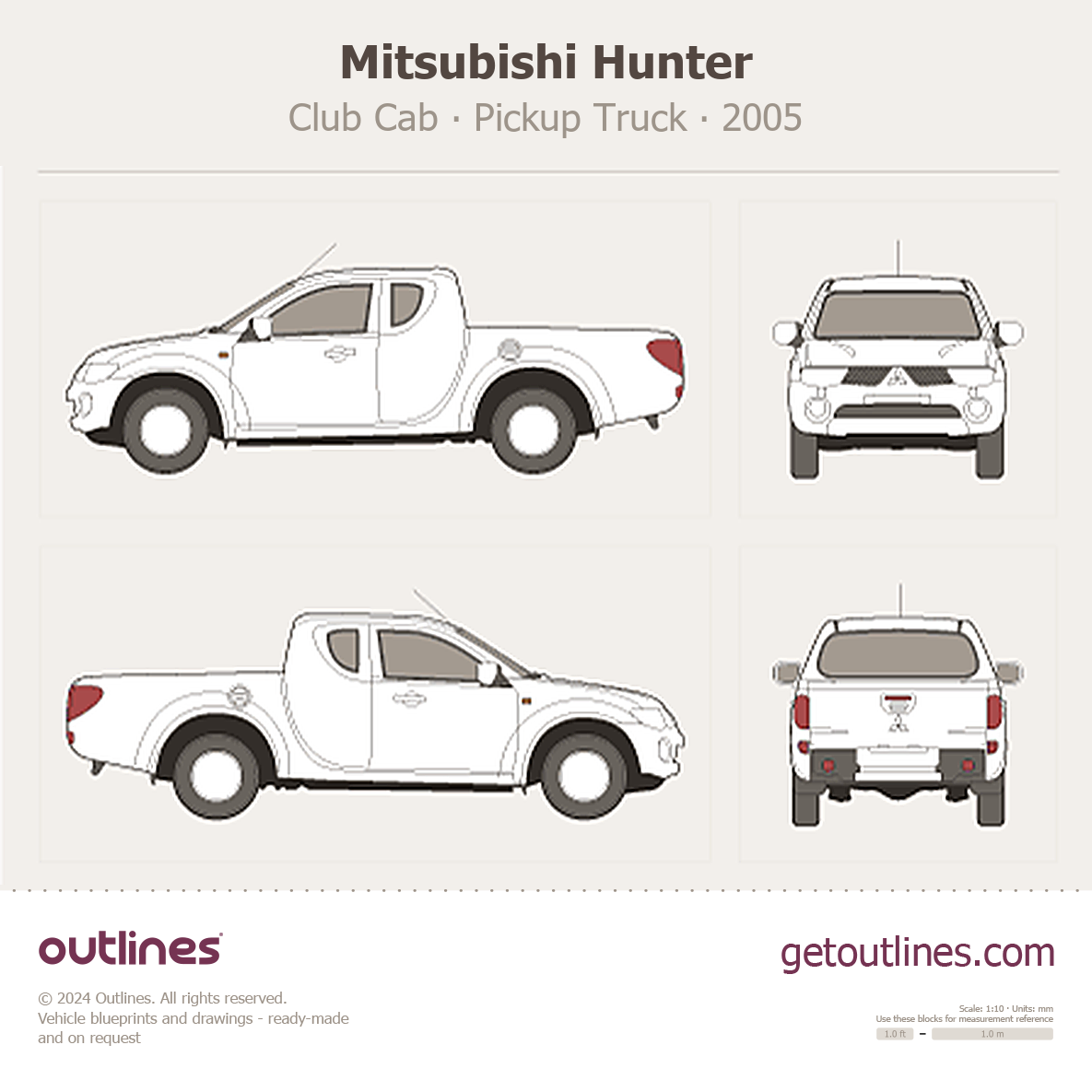 This is a blueprint of the Hunter, produced by carmaker Mitsubishi in 2005 - 2015. It features a Pickup Truck body design and is classified as a Commercial vehicle.