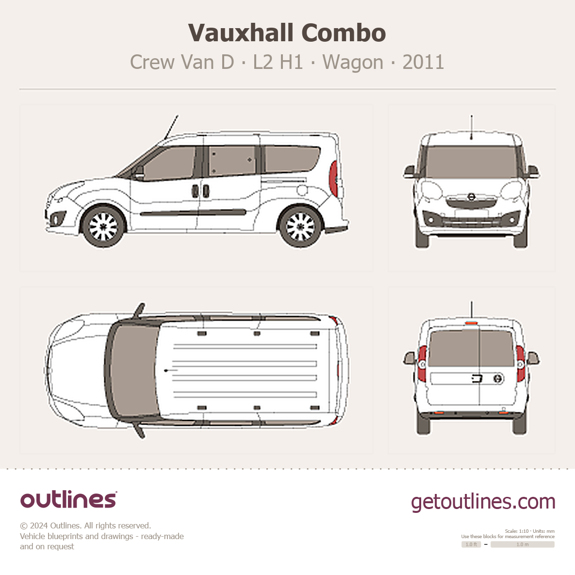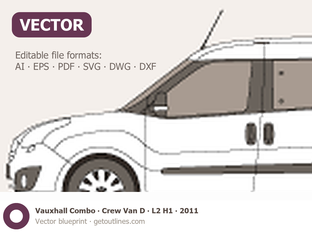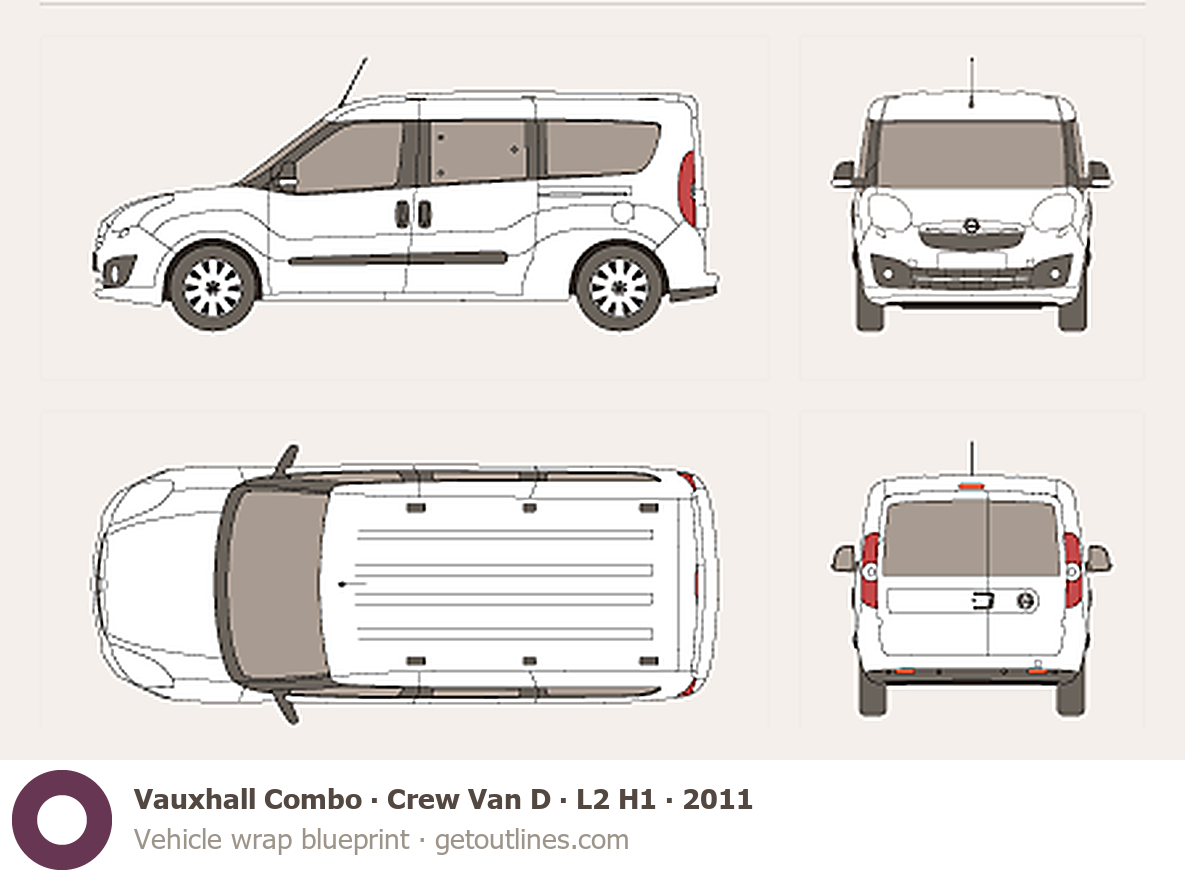 This 2011 Vauxhall Combo Crew Van D L2 H1 Wagon blueprint helps designers, wrap studios, and 3D artists simplify their workflow and save valuable time for creative work instead of routine tasks.
