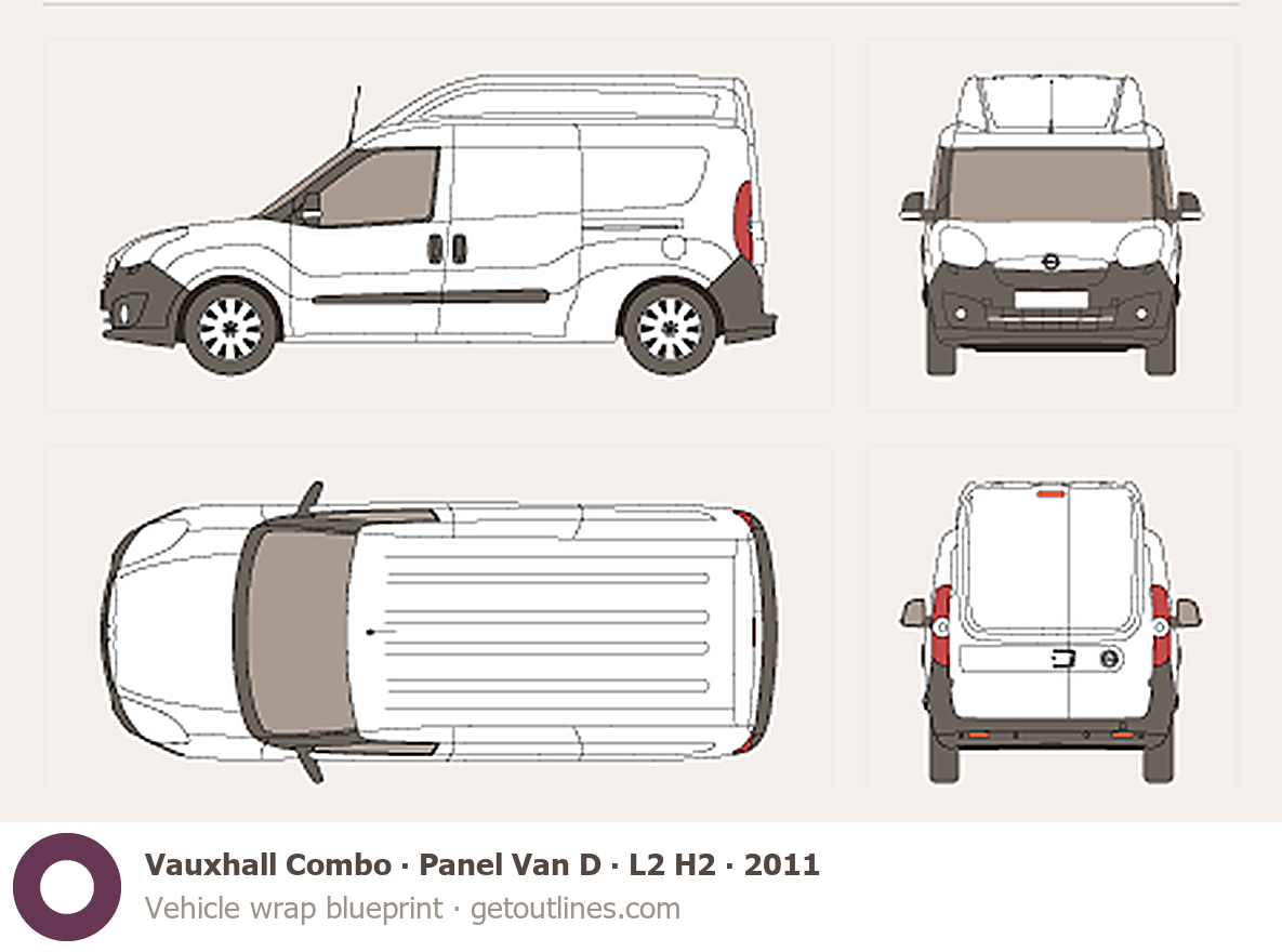 This 2011 Vauxhall Combo Panel Van D L2 H2 Wagon blueprint helps designers, wrap studios, and 3D artists simplify their workflow and save valuable time for creative work instead of routine tasks.