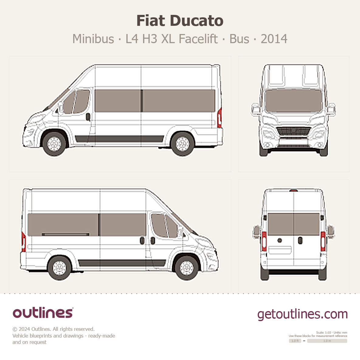 This 2014 Fiat Ducato Minibus L4 H3 XL Facelift Bus blueprint helps designers, wrap studios, and 3D artists simplify their workflow and save valuable time for creative work instead of routine tasks.