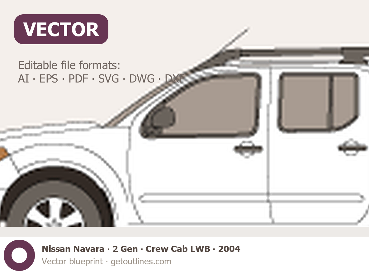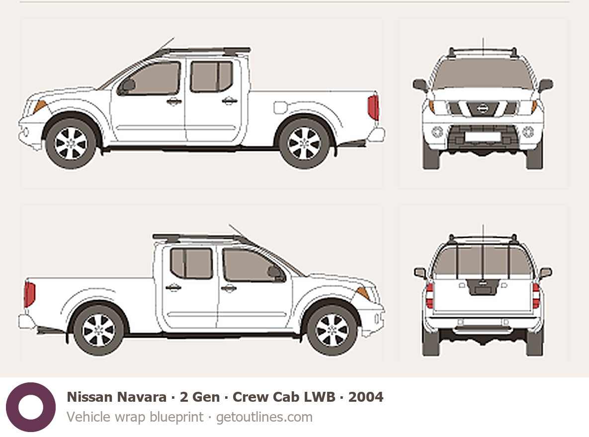 This 2004 Nissan Navara 2 Gen Crew Cab LWB Pickup Truck blueprint helps designers, wrap studios, and 3D artists simplify their workflow and save valuable time for creative work instead of routine tasks.