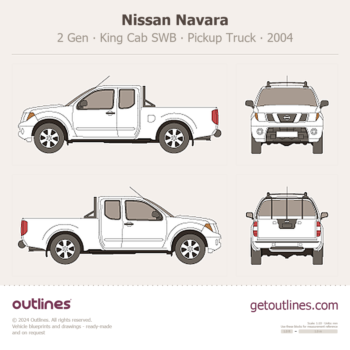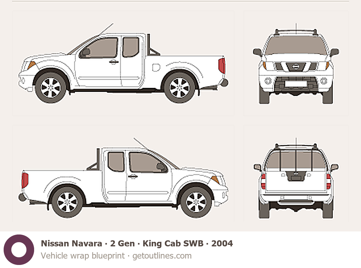 This 2004 Nissan Navara 2 Gen King Cab SWB Pickup Truck blueprint helps designers, wrap studios, and 3D artists simplify their workflow and save valuable time for creative work instead of routine tasks.