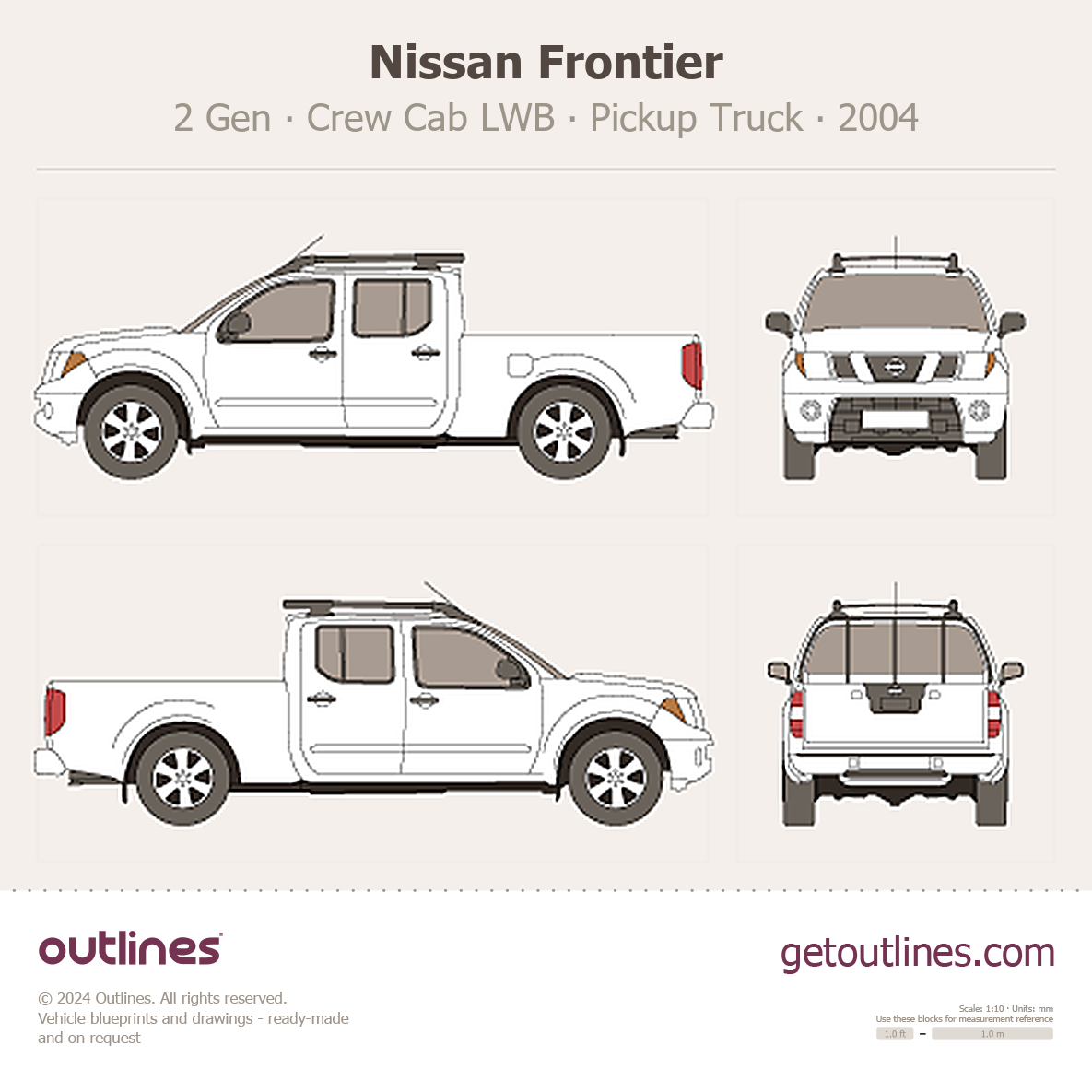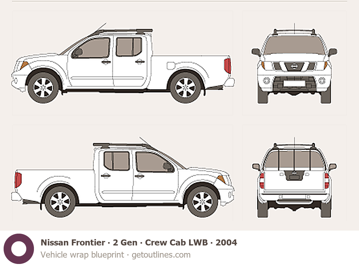 This 2004 Nissan Frontier 2 Gen Crew Cab LWB Pickup Truck blueprint helps designers, wrap studios, and 3D artists simplify their workflow and save valuable time for creative work instead of routine tasks.