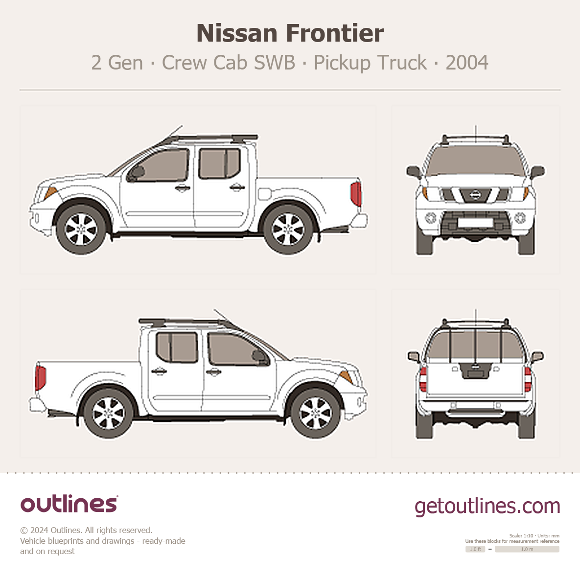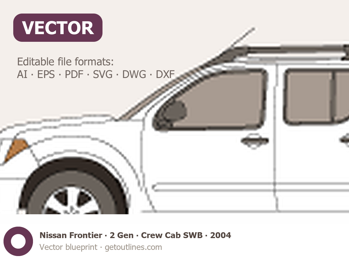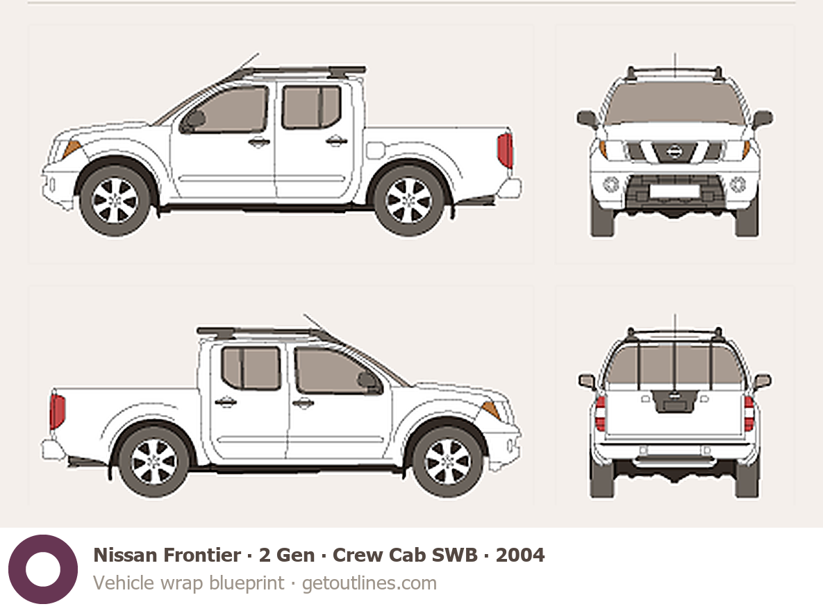 This 2004 Nissan Frontier 2 Gen Crew Cab SWB Pickup Truck blueprint helps designers, wrap studios, and 3D artists simplify their workflow and save valuable time for creative work instead of routine tasks.