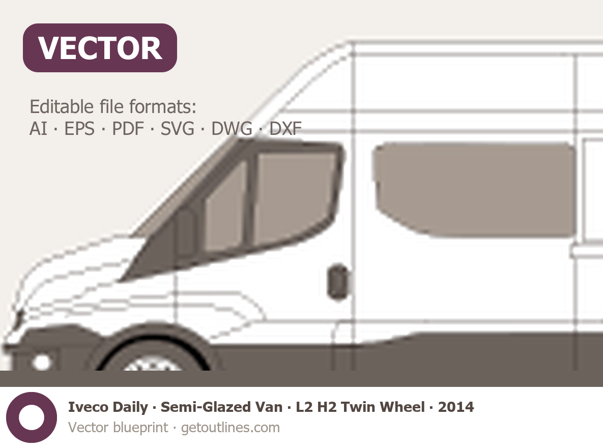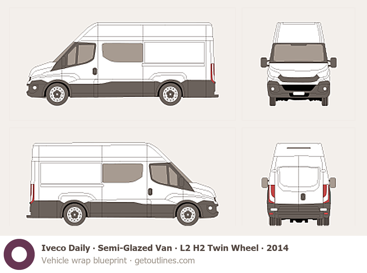 This 2014 Iveco Daily Semi-Glazed Van L2 H2 Twin Wheel Van blueprint helps designers, wrap studios, and 3D artists simplify their workflow and save valuable time for creative work instead of routine tasks.