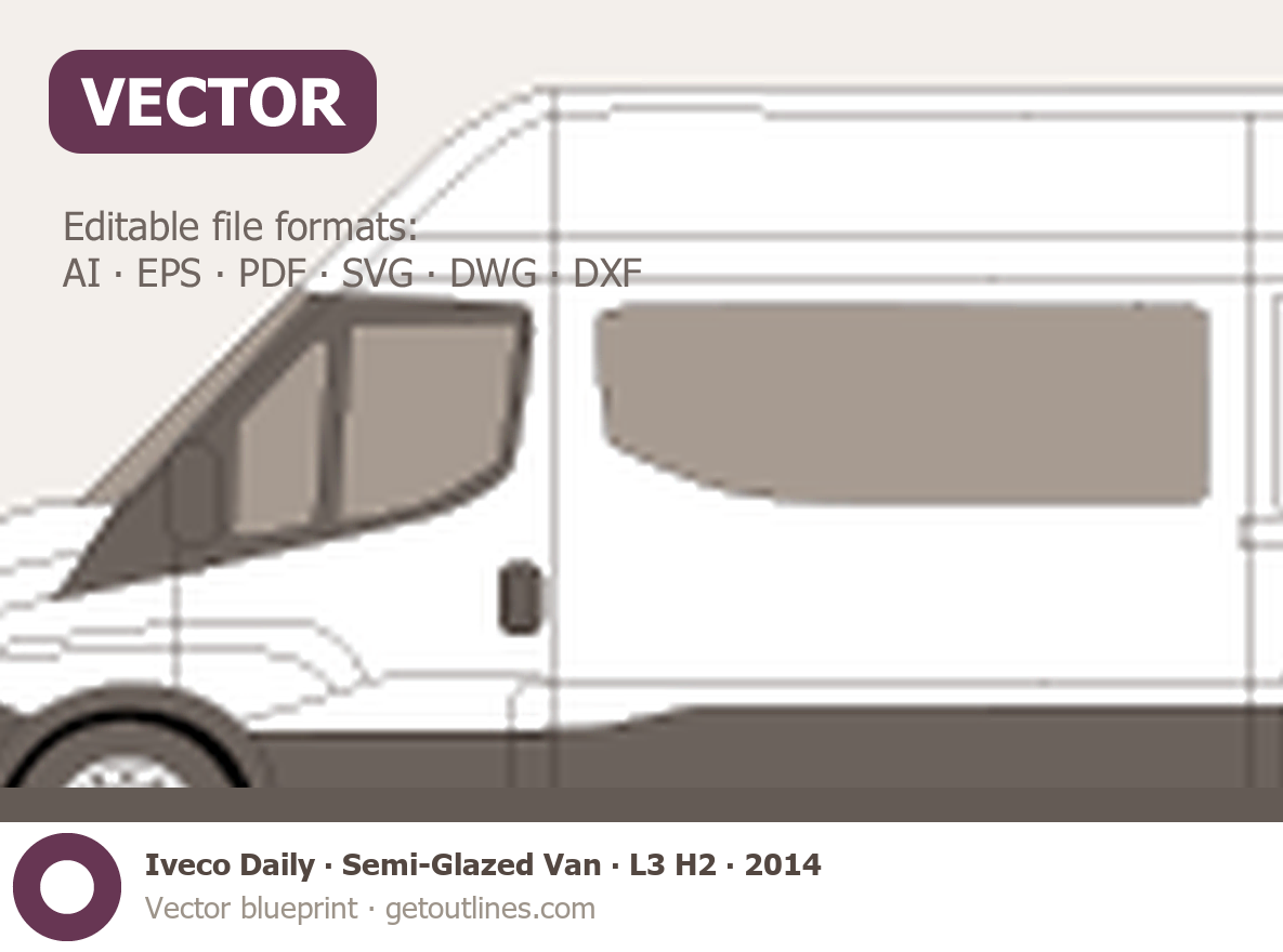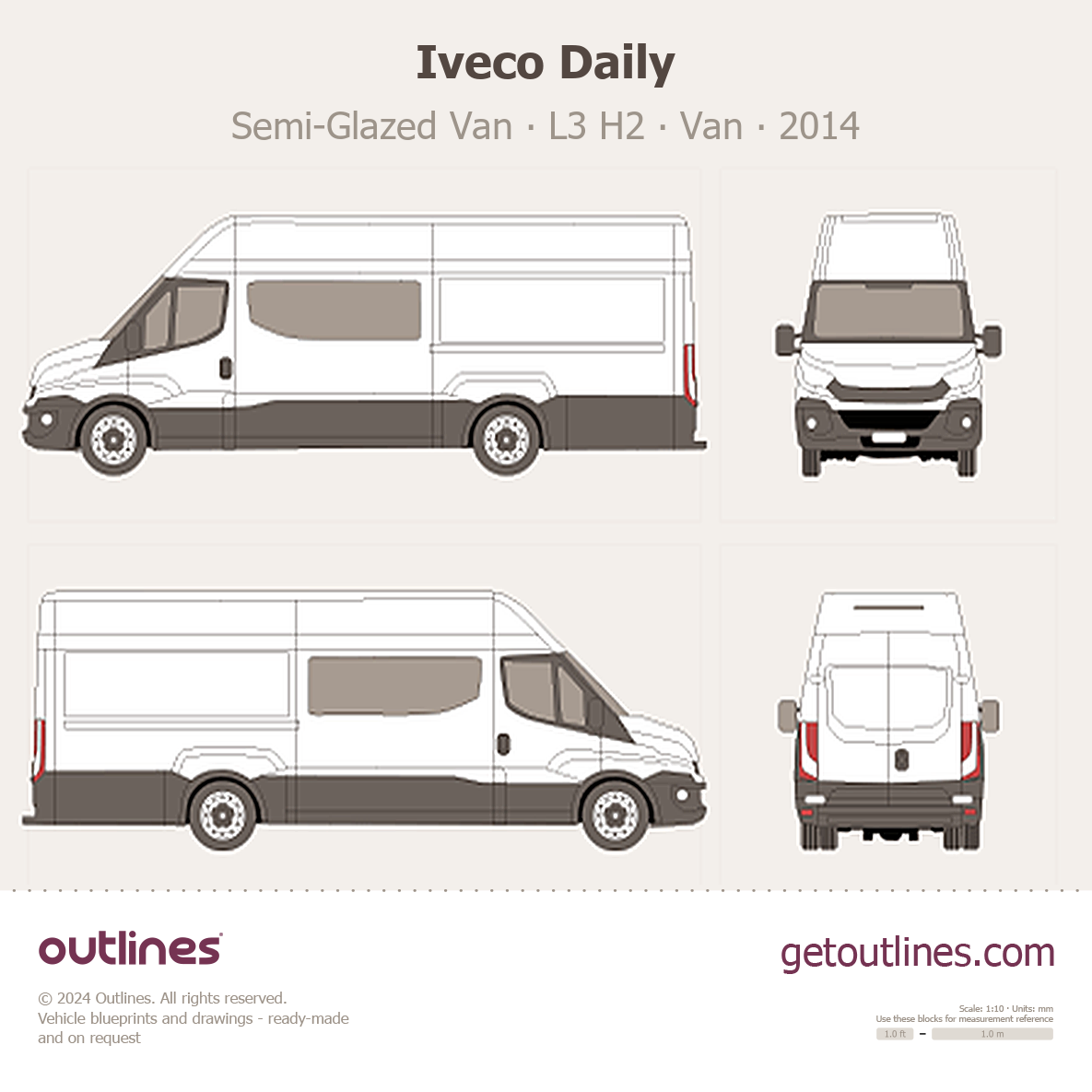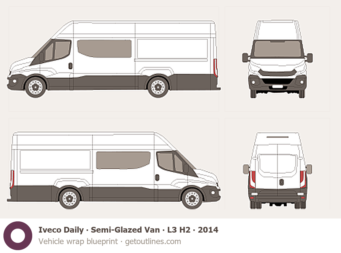 This 2014 Iveco Daily Semi-Glazed Van L3 H2 Van blueprint helps designers, wrap studios, and 3D artists simplify their workflow and save valuable time for creative work instead of routine tasks.